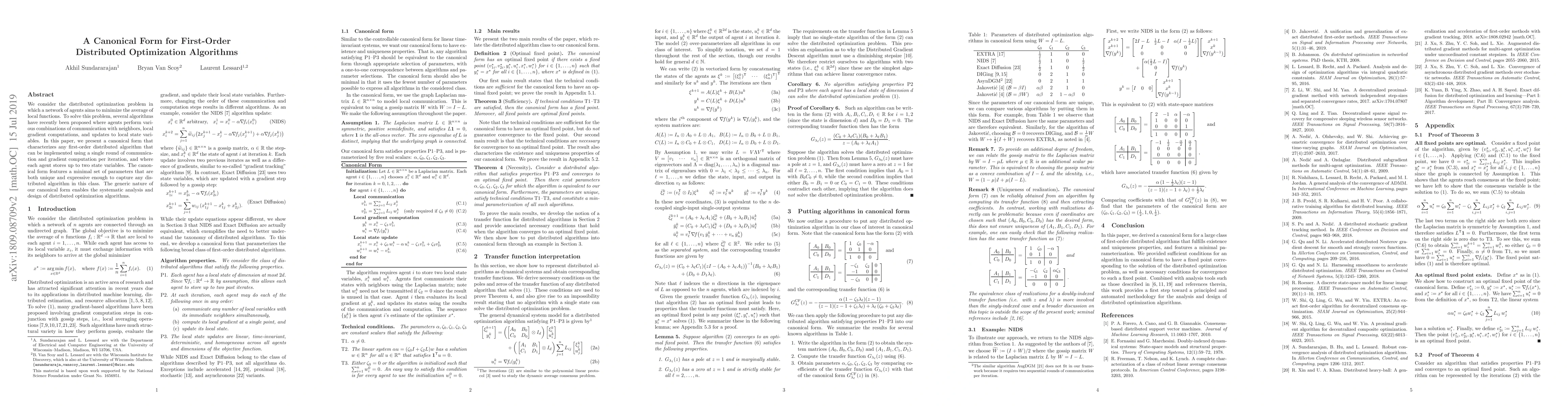 Researchers present a canonical form for first-order distributed optimization algorithms that enables systematic analysis and design of new algorithms, capturing their behavior with minimal parameters.