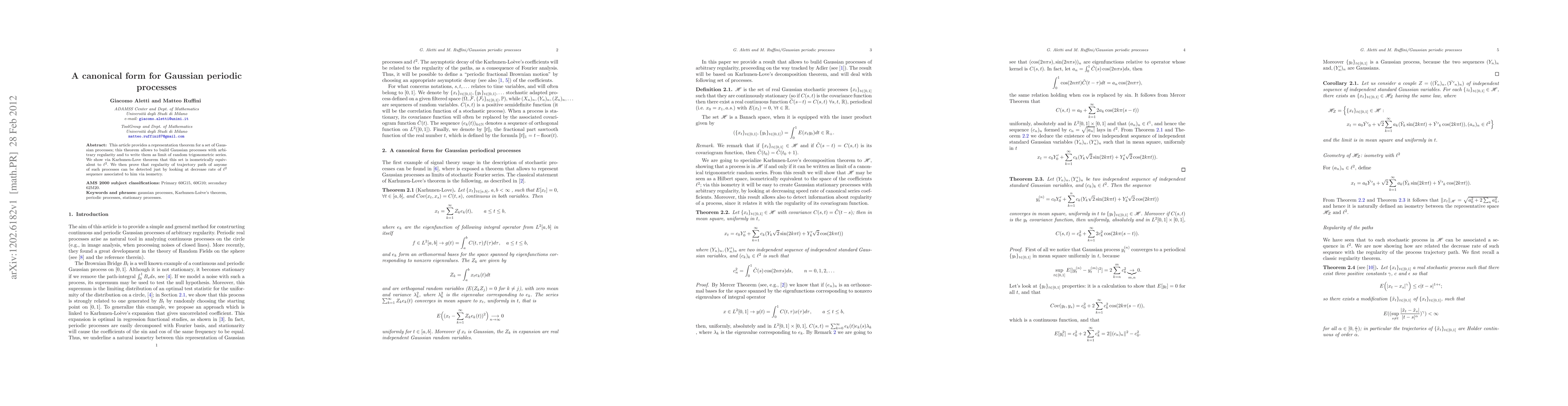 This article provides a representation theorem for a set of Gaussian processes; this theorem allows to build Gaussian processes with arbitrary regularity and to write them as limit of random trigonometric series. We show via Karhunen-Love theorem that this set is isometrically equivalent to l2. We then prove that regularity of trajectory path of anyone of such processes can be detected just by looking at decrease rate of l2 sequence associated to him via isometry.