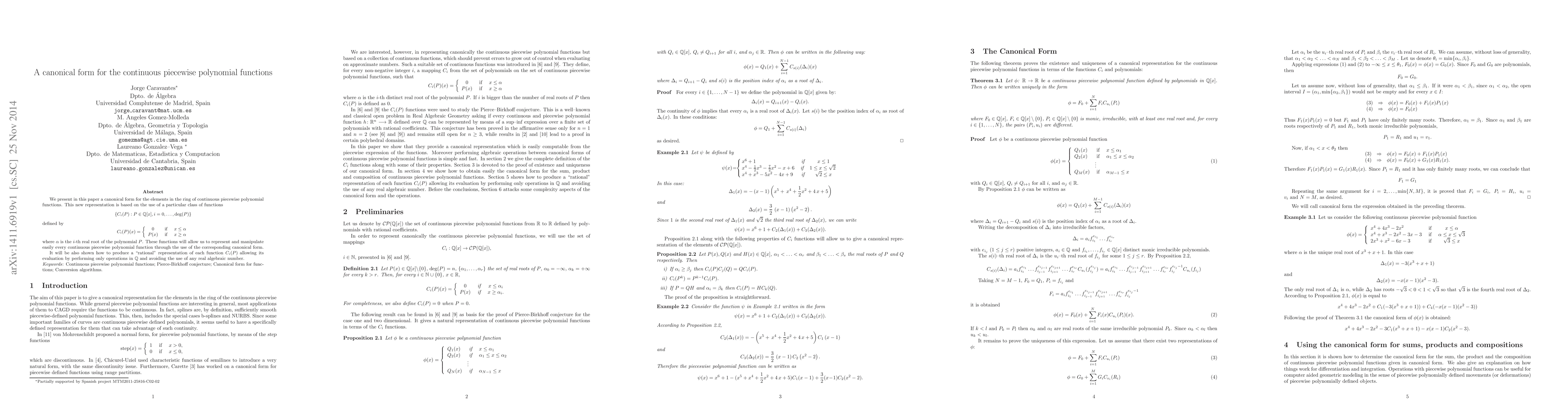 This paper introduces a canonical form for continuous piecewise polynomial functions using a class of functions defined by specific polynomial roots, enabling easy representation and manipulation. It also provides a rational representation for these functions, allowing evaluation without real algebraic numbers.