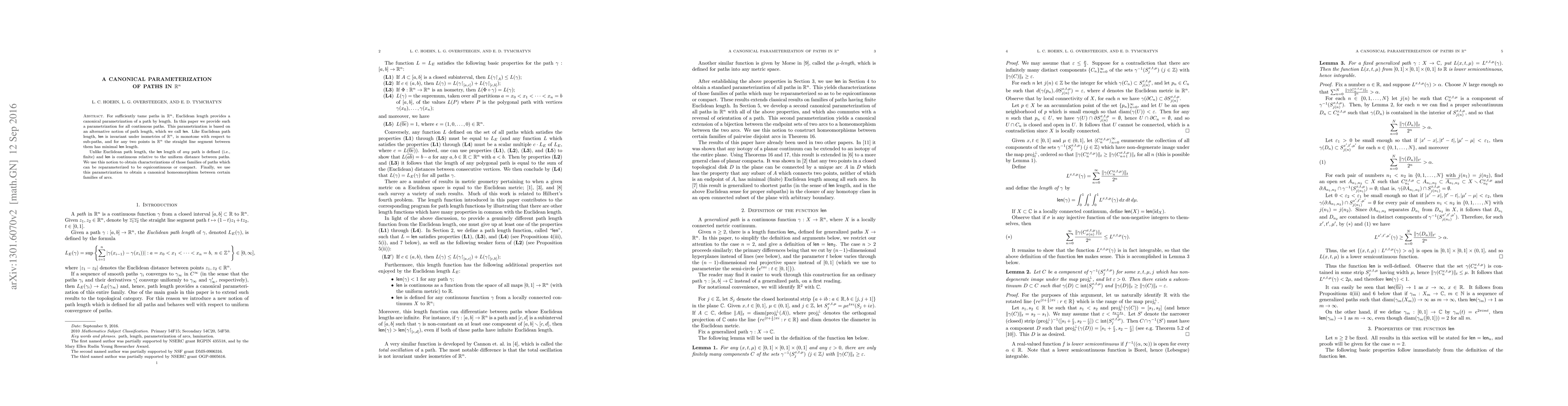 For sufficiently tame paths in $\mathbb{R}^n$, Euclidean length provides a canonical parametrization of a path by length. In this paper we provide such a parametrization for all continuous paths. This parametrization is based on an alternative notion of path length, which we call $\mathsf{len}$. Like Euclidean path length, $\mathsf{len}$ is invariant under isometries of $\mathbb{R}^n$, is monotone with respect to sub-paths, and for any two points in $\mathbb{R}^n$ the straight line segment between them has minimal $\mathsf{len}$ length. Unlike Euclidean path length, the $\mathsf{len}$ length of any path is defined (i.e., finite) and $\mathsf{len}$ is continuous relative to the uniform distance between paths. We use this notion to obtain characterizations of those families of paths which can be reparameterized to be equicontinuous or compact. Finally, we use this parametrization to obtain a canonical homeomorphism between certain families of arcs.