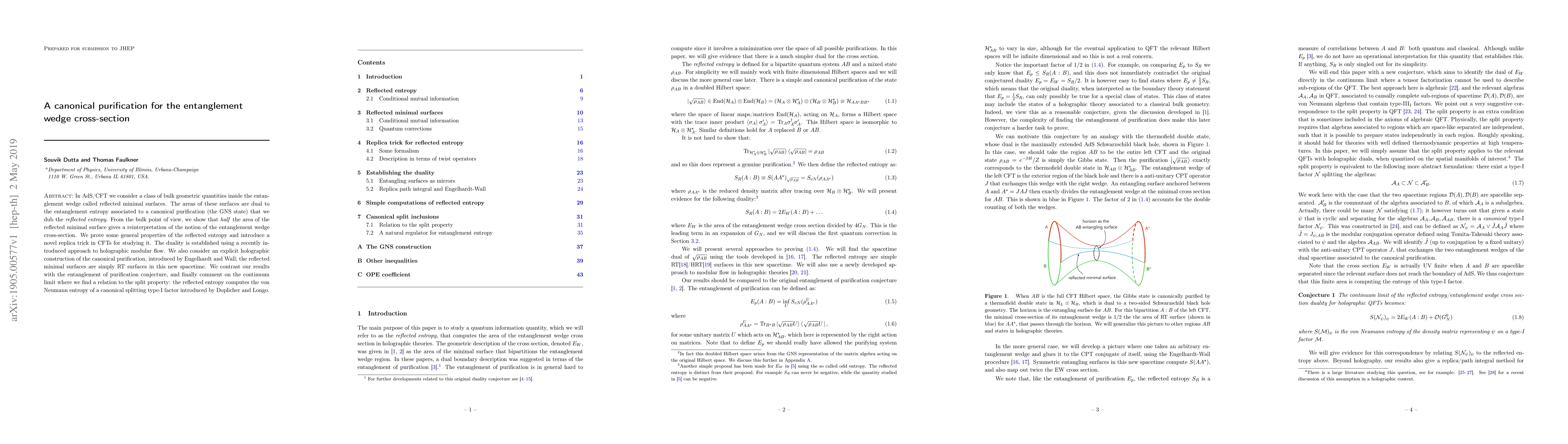 This paper explores reflected minimal surfaces in the AdS/CFT context to define a new measure of entanglement entropy, termed reflected entropy, which corresponds to the entanglement associated with a canonical purification. It reinterprets the entanglement wedge cross-section using the area of these surfaces and introduces a novel replica trick for studying it, establishing the duality through holographic modular flow.