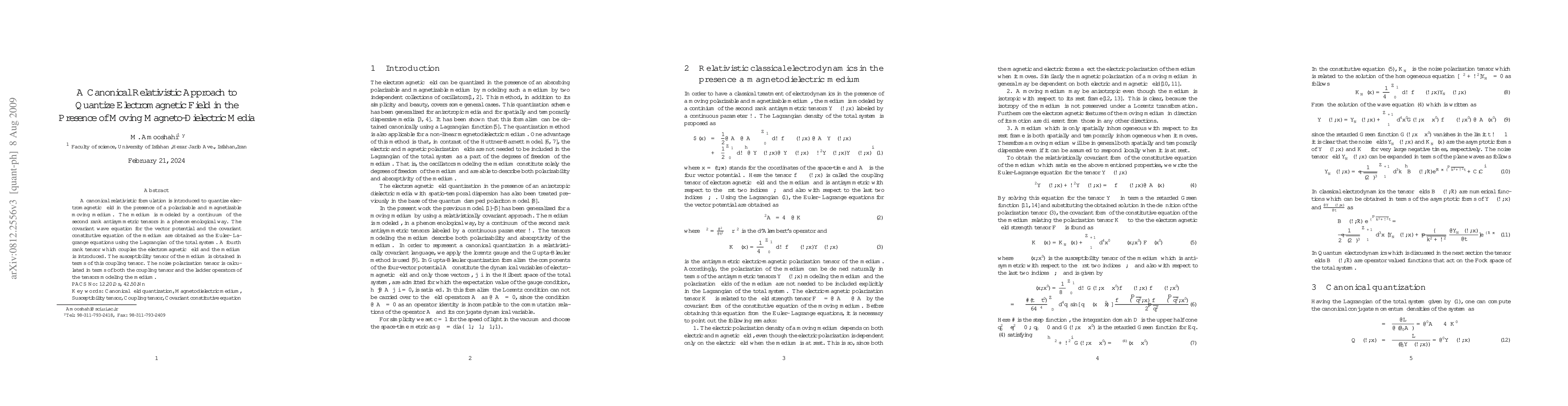 A canonical relativistic formulation is introduced to quantize electromagnetic field in the presence of a polarizable and magnetizable moving medium. The medium is modeled by a continuum of four vectors in a phenomenological way. The covariant wave equation for the vector potential and the covariant constitutive equation of the medium are obtained as the Euler- Lagrange equations using the Lagrangian of the total system. A tensor of the third rank which couples the electromagnetic field with the medium is introduced and the susceptibility tensor of the medium is obtained in terms of the coupling tensor. Also the noise polarization tensor is calculated in terms of the coupling tensor and the creation and annihilation operators of the four vectors modeling the medium.