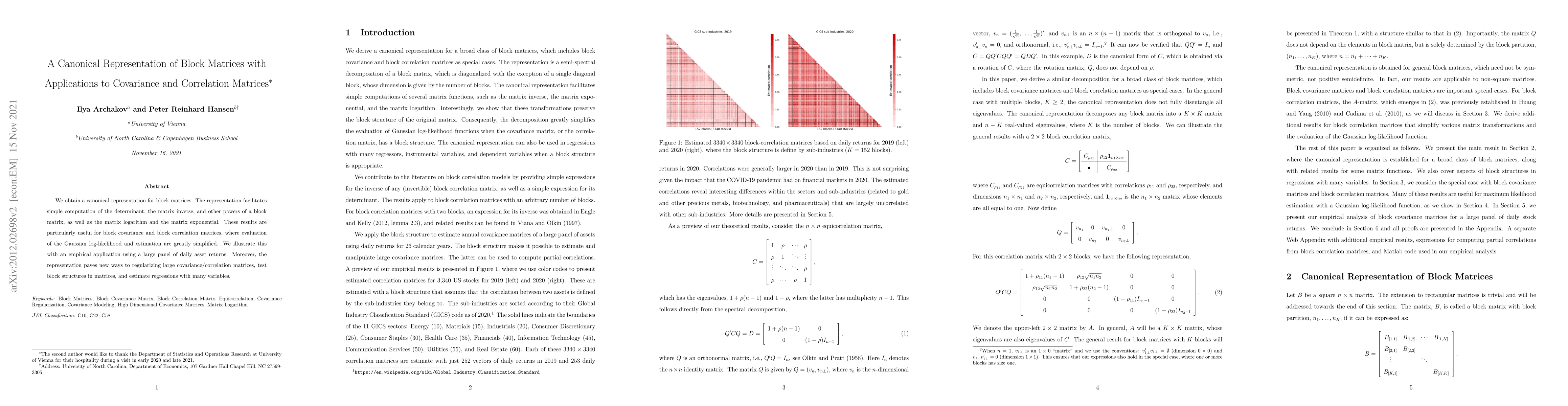 This paper presents a canonical representation for block matrices that simplifies computations like determinant, inverse, matrix powers, logarithm, and exponential. The method is particularly beneficial for handling block covariance and correlation matrices, facilitating Gaussian log-likelihood evaluation and estimation, and enabling new approaches to regularization, testing block structures, and estimating regressions with many variables.