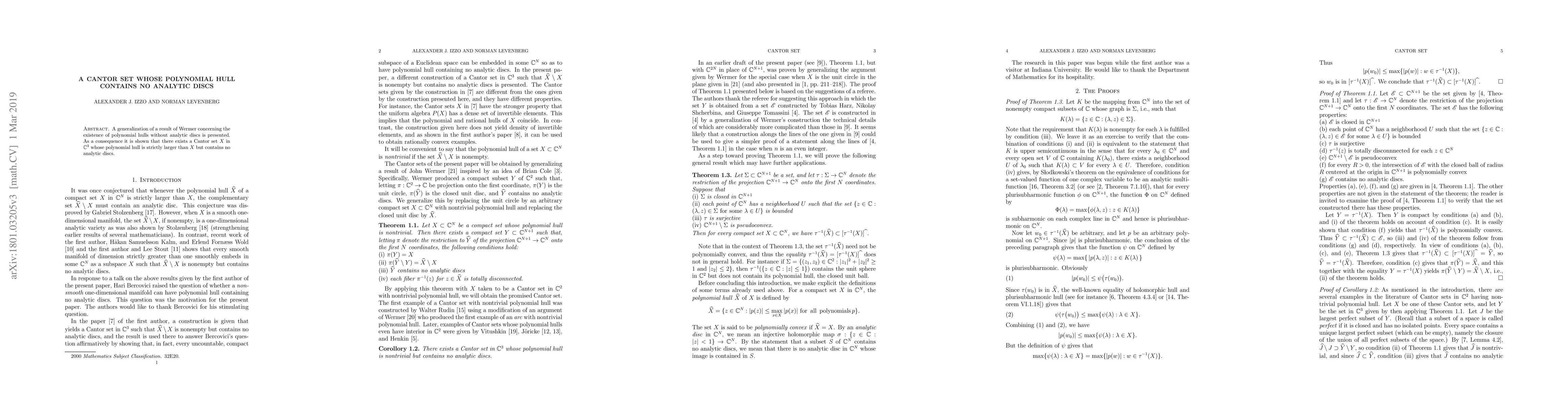 This paper generalizes Wermer's result on polynomial hulls, demonstrating a Cantor set $X$ in ${\mathbb C}^3$ where the polynomial hull is larger than $X$ but lacks analytic discs.