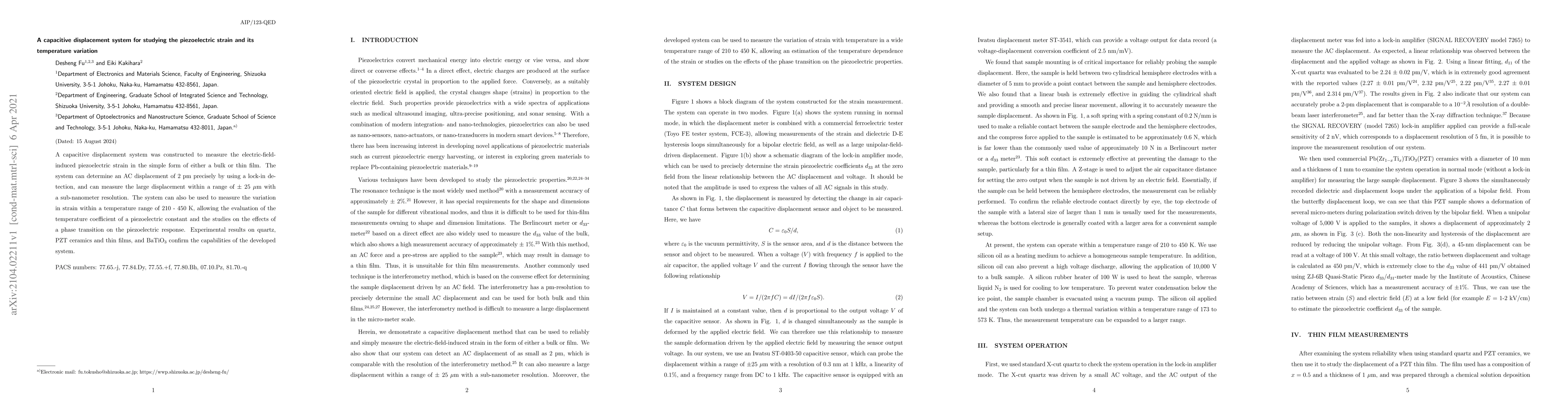 A capacitive displacement system was constructed to measure the electric-field-induced piezoelectric strain in the simple form of either a bulk or thin film. The system can determine an AC displacement of 2 pm precisely by using a lock-in detection, and can measure the large displacement within a range of $\pm$ 25 $\mu$m with a sub-nanometer resolution. The system can also be used to measure the variation in strain within a temperature range of 210 - 450 K, allowing the evaluation of the temperature coefficient of a piezoelectric constant and the studies on the effects of a phase transition on the piezoelectric response. Experimental results on quartz, PZT ceramics and thin films, and BaTiO$_3$ confirm the capabilities of the developed system.