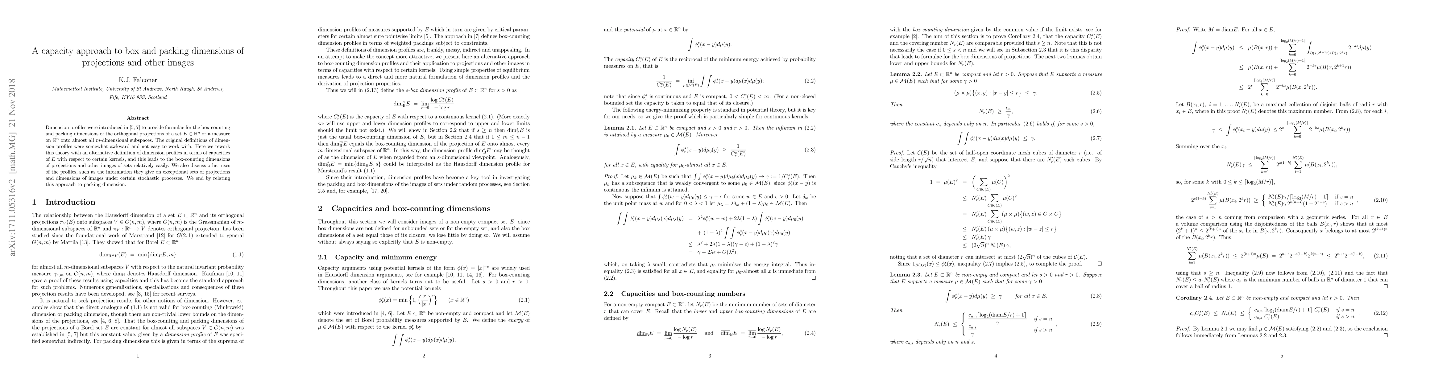 This paper redefines dimension profiles using capacities to simplify the calculation of box-counting dimensions for projections and other images of sets. It also explores the applications of these profiles in understanding exceptional sets and dimensions under stochastic processes, and connects the approach to packing dimension.