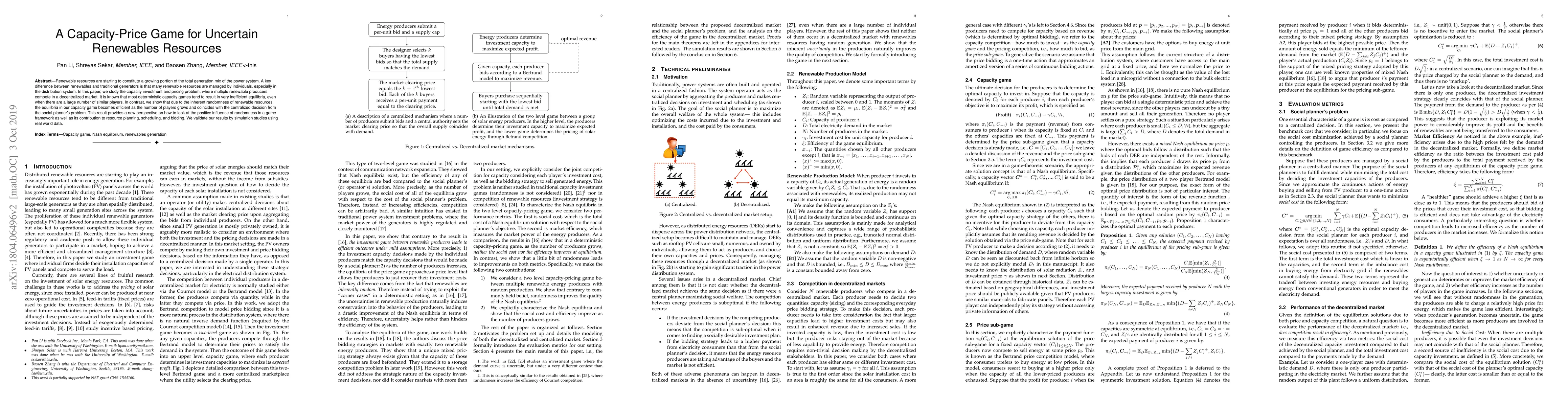 Renewable resources are starting to constitute a growing portion of the total generation mix of the power system. A key difference between renewables and traditional generators is that many renewable resources are managed by individuals, especially in the distribution system. In this paper, we study the capacity investment and pricing problem, where multiple renewable producers compete in a decentralized market. It is known that most deterministic capacity games tend to result in very inefficient equilibria, even when there are a large number of similar players. In contrast, we show that due to the inherent randomness of renewable resources, the equilibria in our capacity game becomes efficient as the number of players grows and coincides with the centralized decision from the social planner's problem. This result provides a new perspective on how to look at the positive influence of randomness in a game framework as well as its contribution to resource planning, scheduling, and bidding. We validate our results by simulation studies using real world data.