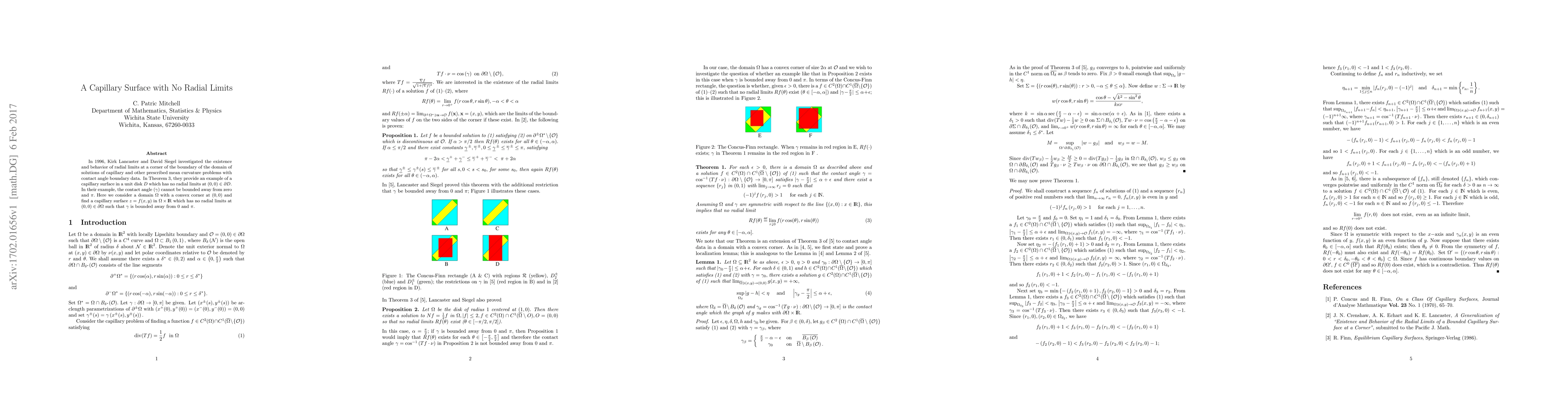 In 1996, Kirk Lancaster and David Siegel investigated the existence and behavior of radial limits at a corner of the boundary of the domain of solutions of capillary and other prescribed mean curvature problems with contact angle boundary data. In Theorem 3, they provide an example of a capillary surface in a unit disk $D$ which has no radial limits at $(0,0)\in\partial D.$ In their example, the contact angle ($\gamma$) cannot be bounded away from zero and $\pi.$ Here we consider a domain $\Omega$ with a convex corner at $(0,0)$ and find a capillary surface $z=f(x,y)$ in $\Omega\times\mathbb{R}$ which has no radial limits at $(0,0)\in\partial\Omega$ such that $\gamma$ is bounded away from $0$ and $\pi.$