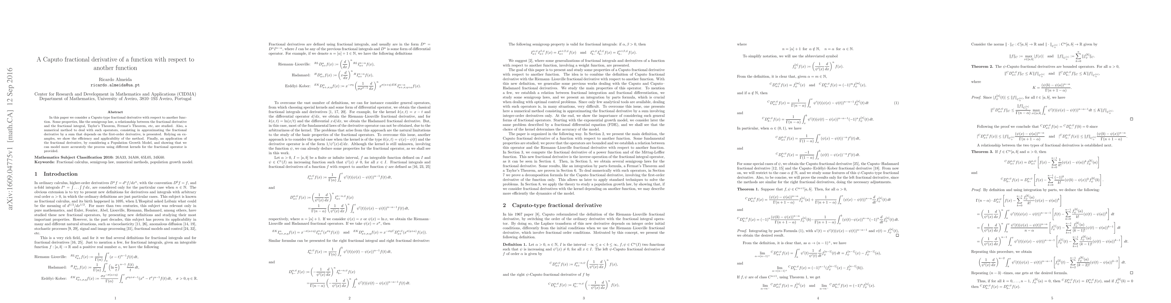 This paper explores a Caputo fractional derivative defined with respect to another function, investigating its properties and presenting a numerical method for approximation. It demonstrates the method's effectiveness through examples and applies it to a Population Growth Model, showing enhanced accuracy using different kernels.