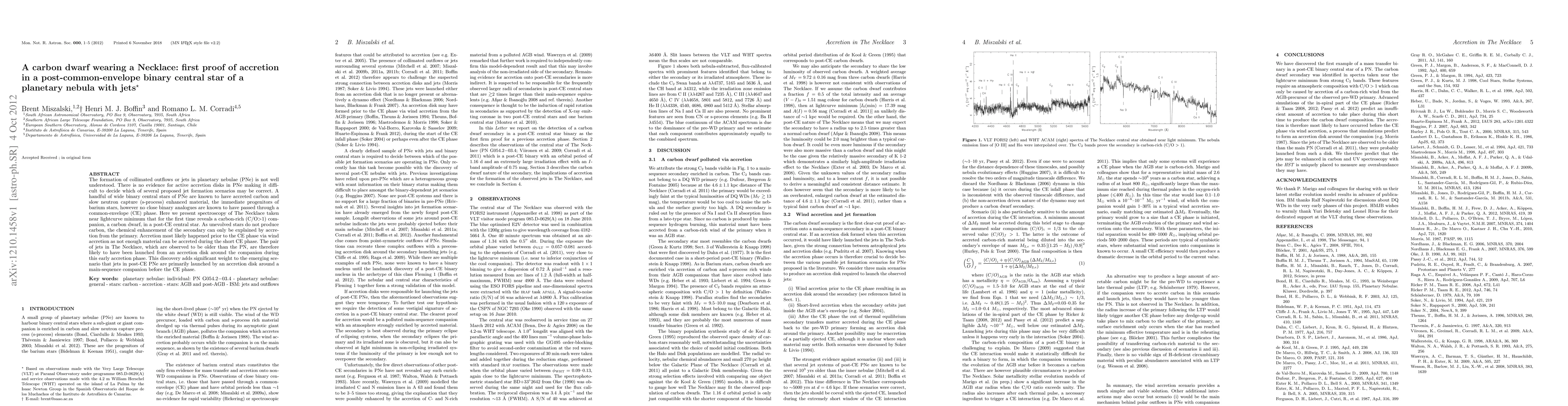 The formation of collimated outflows or jets in planetary nebulae (PNe) is not well understood. There is no evidence for active accretion disks in PNe making it difficult to decide which of several proposed jet formation scenarios may be correct. A handful of wide binary central stars of PNe are known to have accreted carbon and slow neutron capture (s-process) enhanced material, the immediate progenitors of barium stars, however no close binary analogues are known to have passed through a common-envelope (CE) phase. Here we present spectroscopy of The Necklace taken near lightcurve minimum that for the first time reveals a carbon-rich (C/O > 1) companion, a carbon dwarf, in a post-CE central star. As unevolved stars do not produce carbon, the chemical enhancement of the secondary can only be explained by accretion from the primary. Accretion most likely happened prior to the CE phase via wind accretion as not enough material can be accreted during the short CE phase. The pair of jets in The Necklace, which are observed to be older than the PN, are therefore likely to have been launched from an accretion disk around the companion during this early accretion phase. This discovery adds significant weight to the emerging scenario that jets in post-CE PNe are primarily launched by an accretion disk around a main-sequence companion before the CE phase.