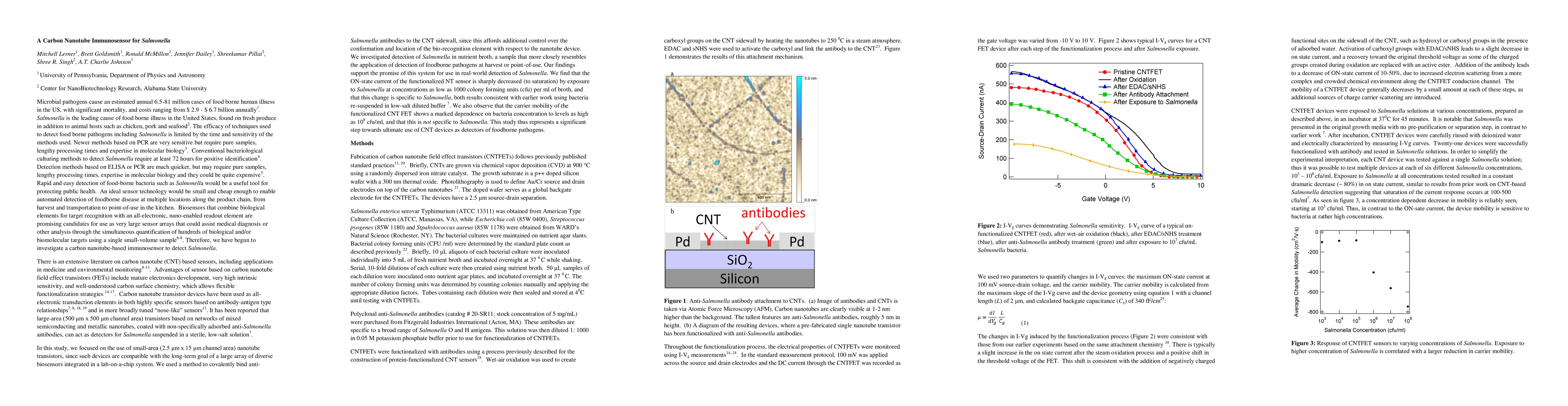 Researchers developed a carbon nanotube immunosensor that can detect Salmonella in food with high sensitivity, even at low concentrations. The device's on-state current is sensitive to Salmonella concentration, making it suitable for large-scale array integration.