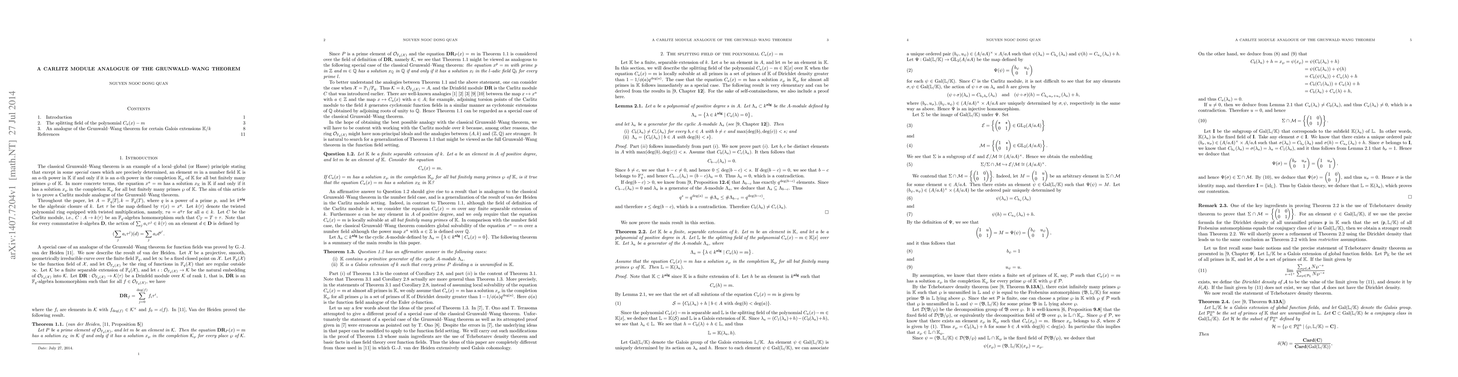 The paper proves a local-to-global principle for Carlitz modules analogous to the classical Grunwald--Wang theorem, showing that elements behave consistently as powers across completions except for specific cases.
