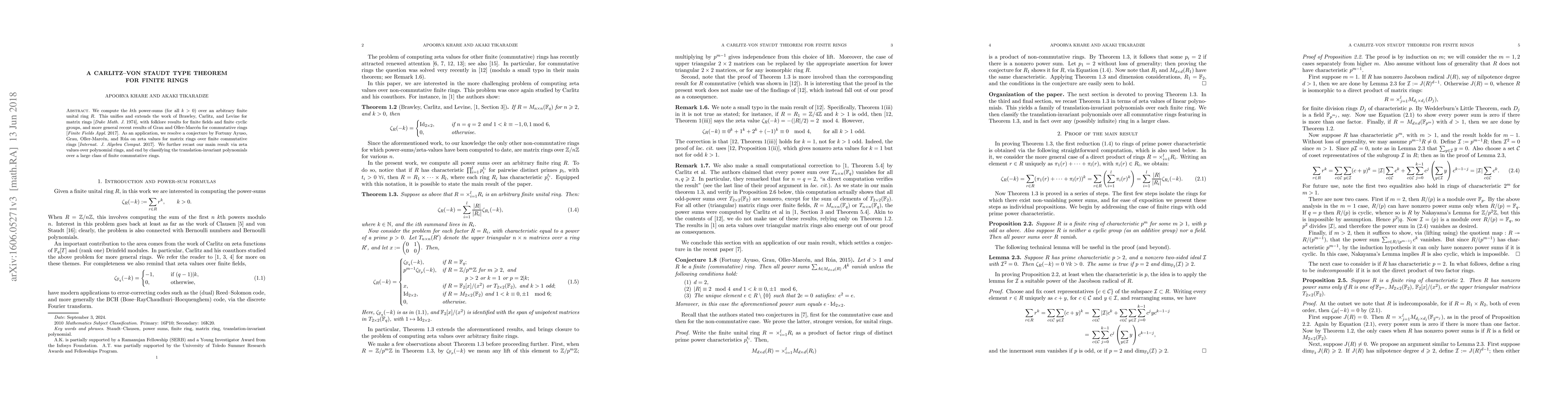 The paper proves a generalization of Carlitz-von Staudt type theorem for finite rings, computing kth power-sums over arbitrary finite unital rings and resolving a conjecture on zeta values.
