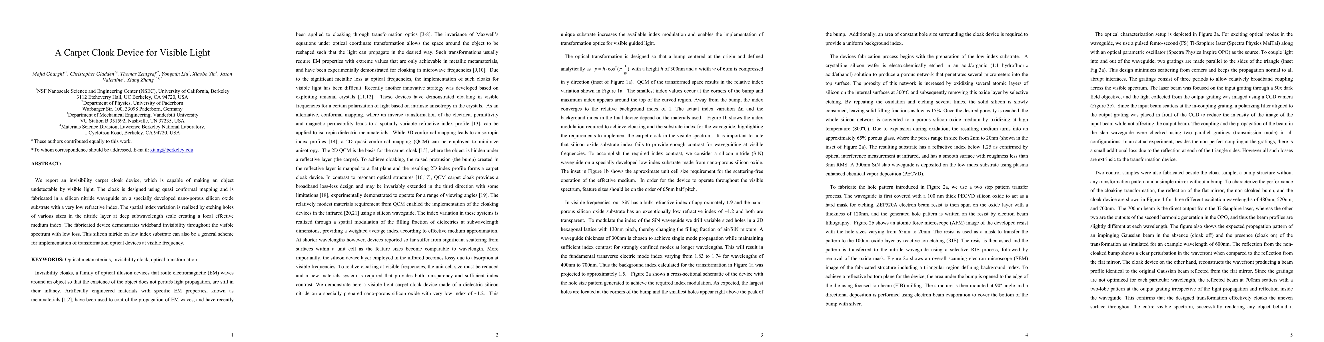 This paper describes a cloaking device made from silicon nitride waveguides on a nano-porous silicon oxide substrate, achieving invisibility for visible light through quasi-conformal mapping and subwavelength etching, demonstrating wideband invisibility with minimal loss across the visible spectrum. The method can serve as a general approach for creating transformation optical devices in the visible frequency range.