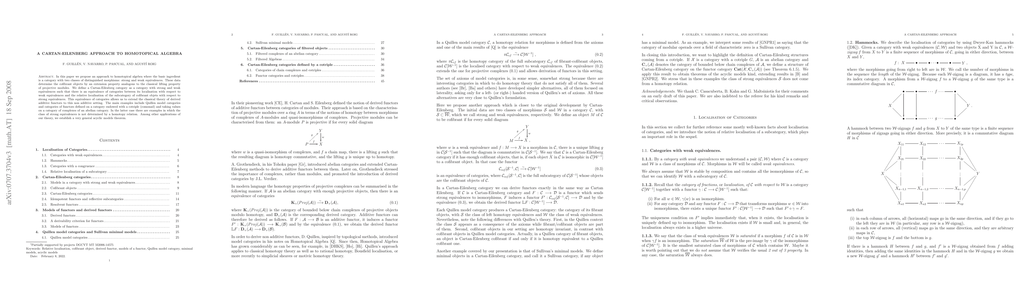 This paper introduces a Cartan-Eilenberg category framework for homotopical algebra, using strong and weak equivalences to define cofibrant objects and extend classical derived functor theory. It applies this framework to Quillen model categories and functor categories, proving the existence of filtered minimal models for cdg algebras and formulating an acyclic models theorem for non-additive functors.