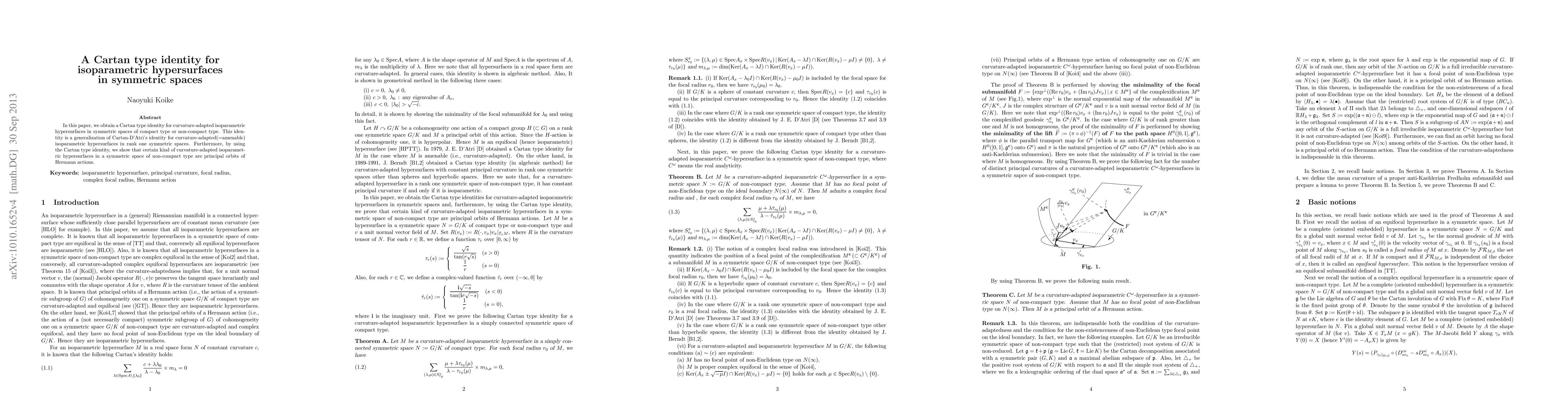Summary: This paper establishes a generalized Cartan type identity for curvature-adapted isoparametric hypersurfaces in both compact and non-compact symmetric spaces, extending Cartan-D'Atri's identity, and demonstrates that certain hypersurfaces in non-compact symmetric spaces are principal orbits of Hermann actions.