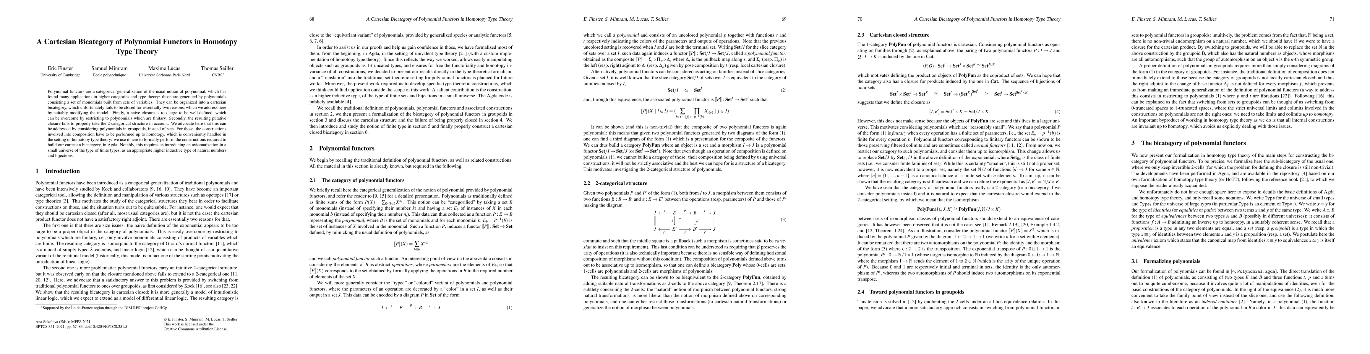 This paper constructs a Cartesian bicategory of polynomial functors within homotopy type theory, addressing the closure issues by restricting to finitary polynomials and considering polynomials in groupoids. The constructions are formalized in Agda, leveraging homotopy type theory to handle compositions up to homotopy.