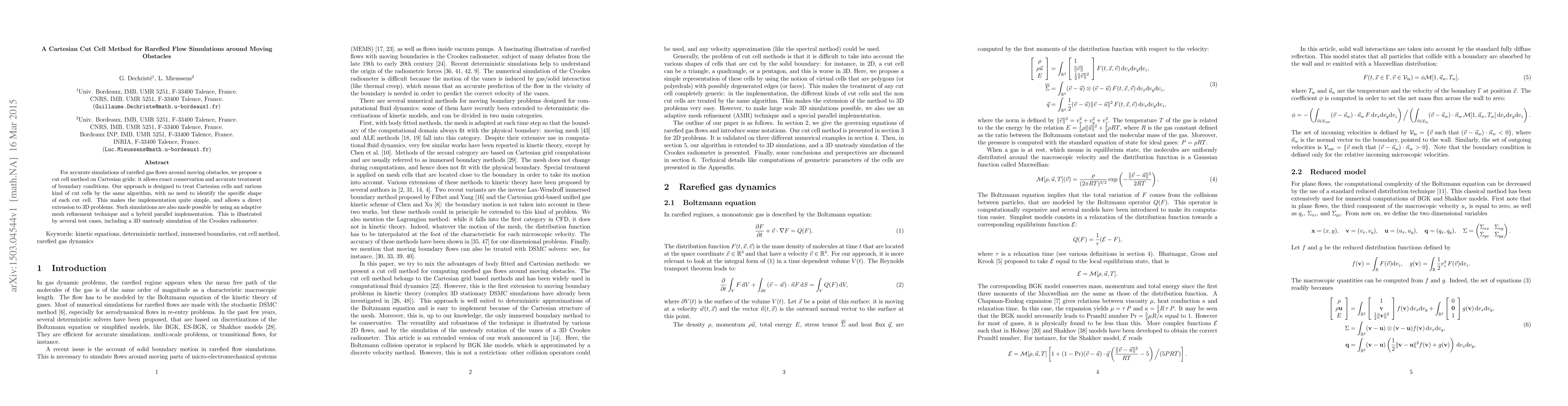 This paper proposes a Cartesian cut cell method for simulating rarefied gas flows around moving obstacles, ensuring exact conservation and accurate boundary conditions. The method simplifies implementation and extends easily to 3D, aided by adaptive mesh refinement and parallel computing, demonstrated through test cases like the 3D Crookes radiometer.