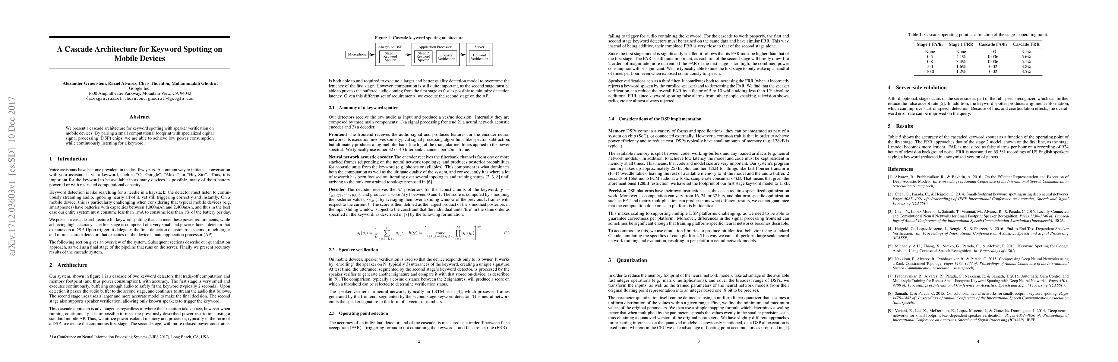 This paper introduces a cascade architecture for efficient keyword spotting and speaker verification on mobile devices, utilizing specialized DSP chips to maintain low power consumption while enabling continuous keyword listening.