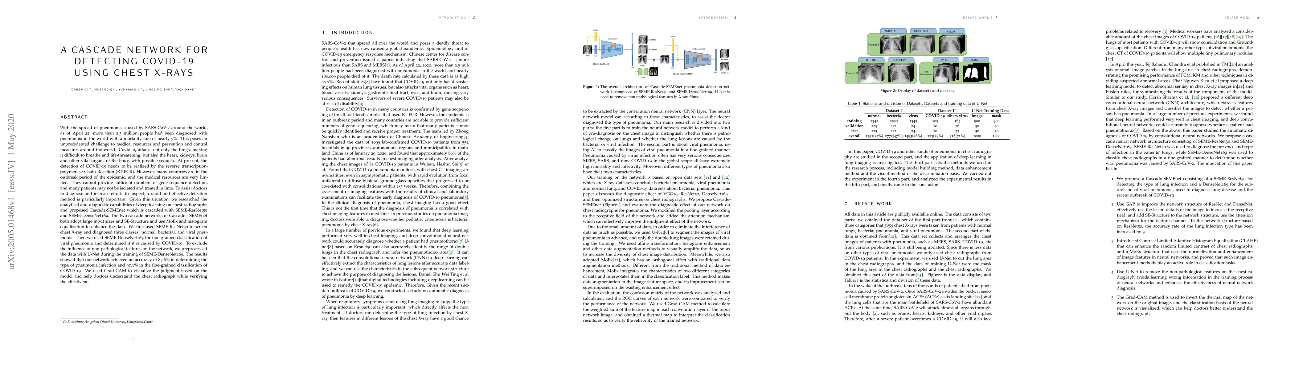 The worldwide spread of pneumonia caused by a novel coronavirus poses an unprecedented challenge to the world's medical resources and prevention and control measures. Covid-19 attacks not only the lungs, making it difficult to breathe and life-threatening, but also the heart, kidneys, brain and other vital organs of the body, with possible sequela. At present, the detection of COVID-19 needs to be realized by the reverse transcription-polymerase Chain Reaction (RT-PCR). However, many countries are in the outbreak period of the epidemic, and the medical resources are very limited. They cannot provide sufficient numbers of gene sequence detection, and many patients may not be isolated and treated in time. Given this situation, we researched the analytical and diagnostic capabilities of deep learning on chest radiographs and proposed Cascade-SEMEnet which is cascaded with SEME-ResNet50 and SEME-DenseNet169. The two cascade networks of Cascade - SEMEnet both adopt large input sizes and SE-Structure and use MoEx and histogram equalization to enhance the data. We first used SEME-ResNet50 to screen chest X-ray and diagnosed three classes: normal, bacterial, and viral pneumonia. Then we used SEME-DenseNet169 for fine-grained classification of viral pneumonia and determined if it is caused by COVID-19. To exclude the influence of non-pathological features on the network, we preprocessed the data with U-Net during the training of SEME-DenseNet169. The results showed that our network achieved an accuracy of 85.6\% in determining the type of pneumonia infection and 97.1\% in the fine-grained classification of COVID-19. We used Grad-CAM to visualize the judgment based on the model and help doctors understand the chest radiograph while verifying the effectivene.