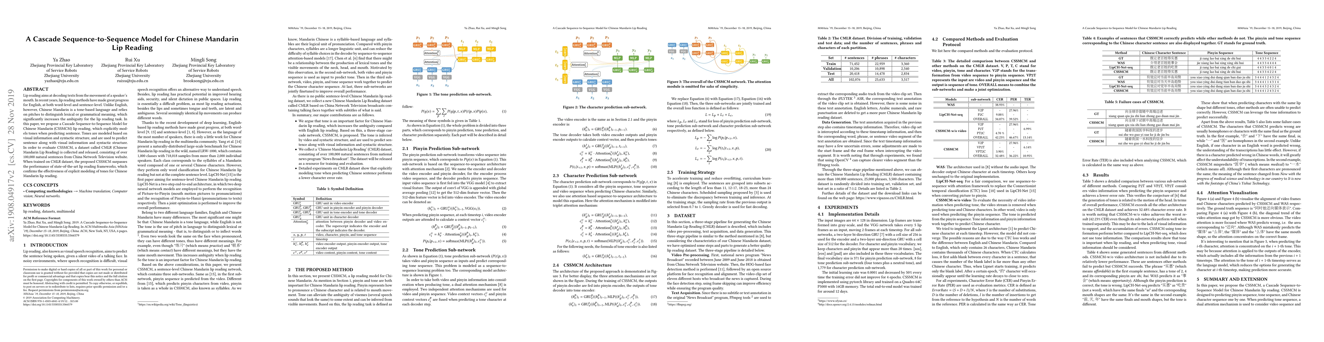 This paper introduces a Cascade Sequence-to-Sequence Model for Chinese Mandarin lip reading (CSSMCM) that specifically models tones, enhancing accuracy by incorporating visual and syntactic information. The effectiveness of the model is demonstrated on a newly collected dataset, CMLR, showing superior performance compared to existing frameworks.
