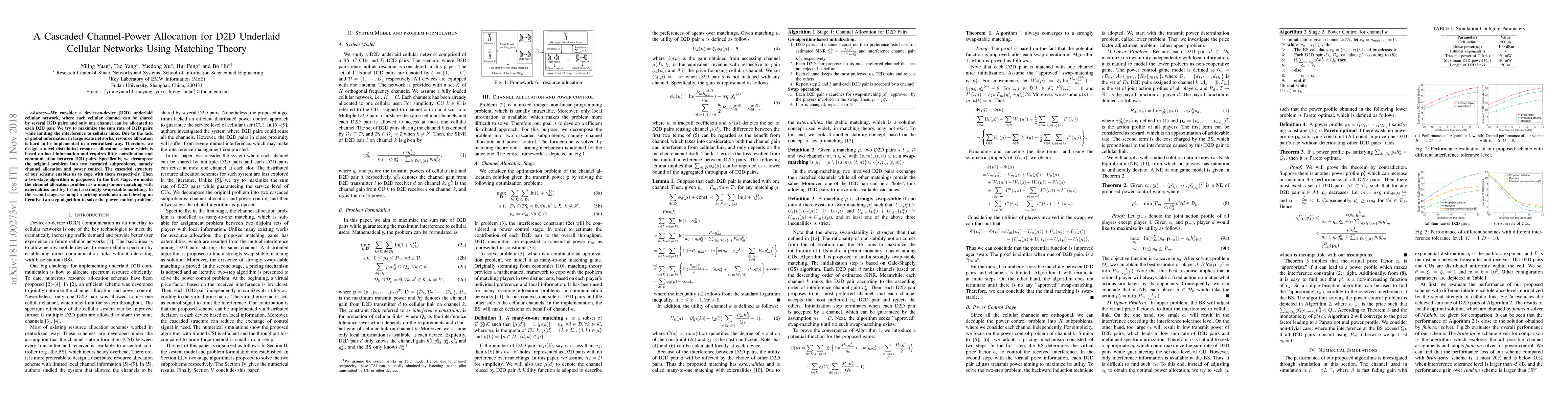 The paper presents a novel distributed resource allocation scheme for D2D underlaid cellular networks, combining matching theory and pricing mechanisms to address channel allocation and power control problems.