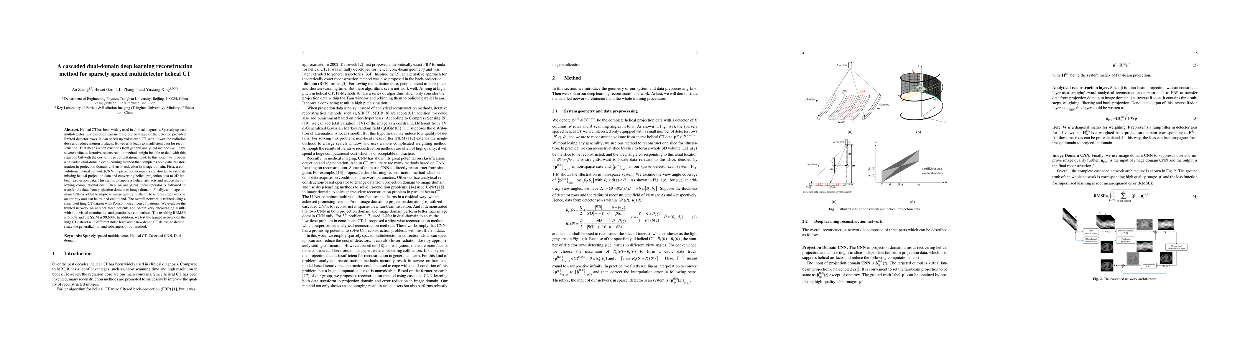 Helical CT has been widely used in clinical diagnosis. Sparsely spaced multidetector in z direction can increase the coverage of the detector provided limited detector rows. It can speed up volumetric CT scan, lower the radiation dose and reduce motion artifacts. However, it leads to insufficient data for reconstruction. That means reconstructions from general analytical methods will have severe artifacts. Iterative reconstruction methods might be able to deal with this situation but with the cost of huge computational load. In this work, we propose a cascaded dual-domain deep learning method that completes both data transformation in projection domain and error reduction in image domain. First, a convolutional neural network (CNN) in projection domain is constructed to estimate missing helical projection data and converting helical projection data to 2D fan-beam projection data. This step is to suppress helical artifacts and reduce the following computational cost. Then, an analytical linear operator is followed to transfer the data from projection domain to image domain. Finally, an image domain CNN is added to improve image quality further. These three steps work as an entirety and can be trained end to end. The overall network is trained using a simulated lung CT dataset with Poisson noise from 25 patients. We evaluate the trained network on another three patients and obtain very encouraging results with both visual examination and quantitative comparison. The resulting RRMSE is 6.56% and the SSIM is 99.60%. In addition, we test the trained network on the lung CT dataset with different noise level and a new dental CT dataset to demonstrate the generalization and robustness of our method.