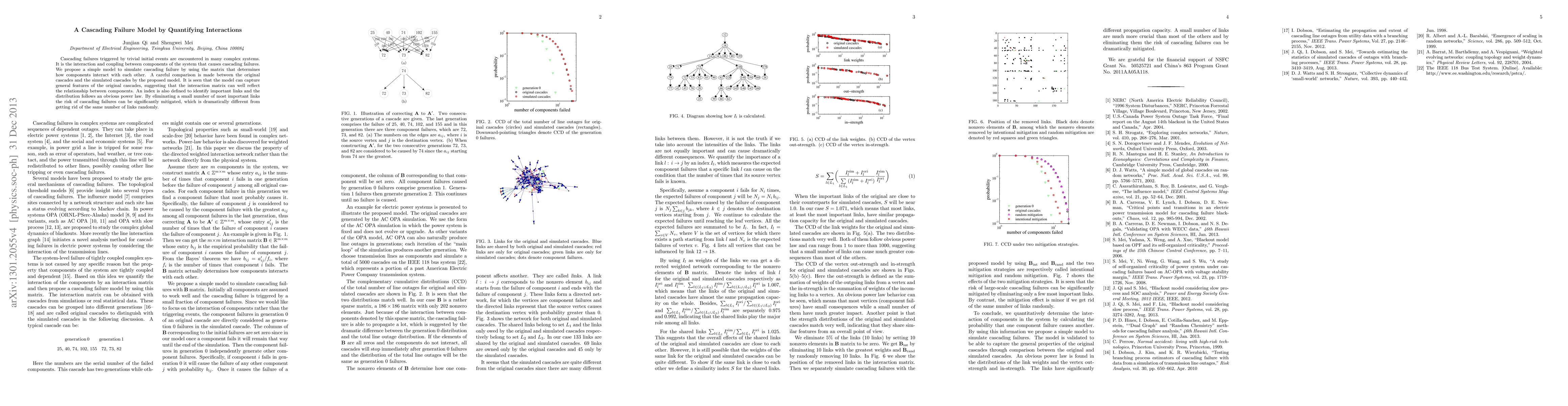 Cascading failures triggered by trivial initial events are encountered in many complex systems. It is the interaction and coupling between components of the system that causes cascading failures. We propose a simple model to simulate cascading failure by using the matrix that determines how components interact with each other. A careful comparison is made between the original cascades and the simulated cascades by the proposed model. It is seen that the model can capture general features of the original cascades, suggesting that the interaction matrix can well reflect the relationship between components. An index is also defined to identify important links and the distribution follows an obvious power law. By eliminating a small number of most important links the risk of cascading failures can be significantly mitigated, which is dramatically different from getting rid of the same number of links randomly.