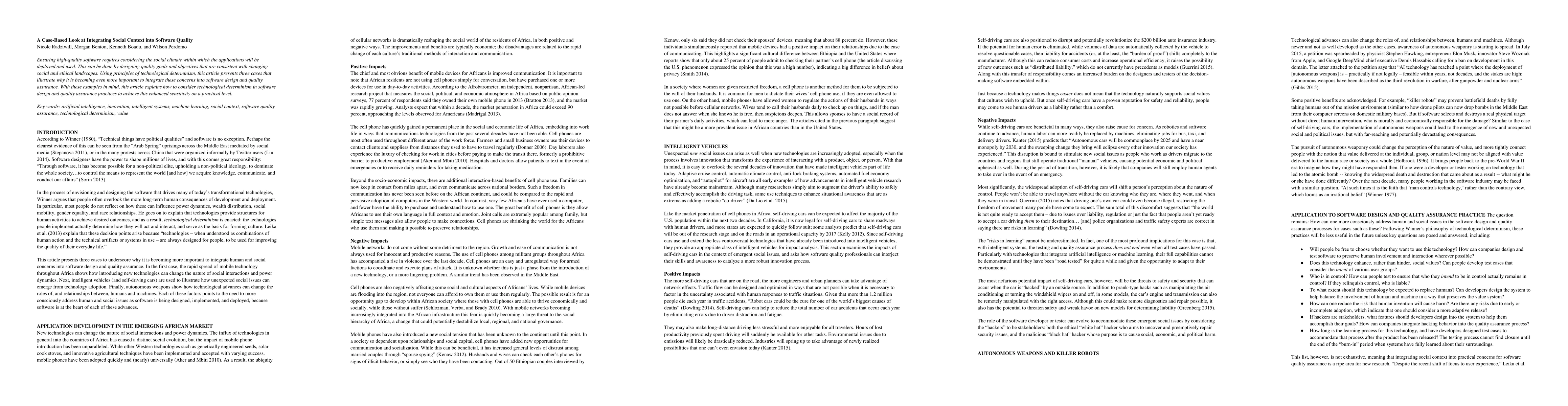 This paper explores the integration of social context into software quality by presenting three case studies that highlight the importance of aligning software design with evolving social and ethical standards. It proposes practical methods for incorporating technological determinism into software quality assurance to enhance social relevance.