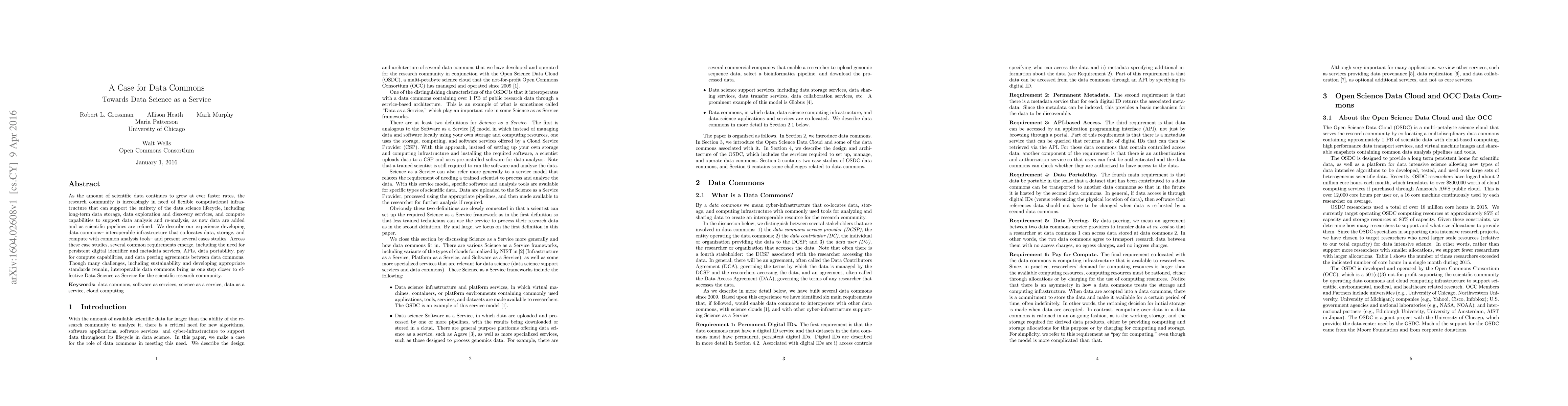 The paper discusses the development of data commons as a flexible computational infrastructure to support the entire data science lifecycle, highlighting the need for persistent identifiers, APIs, and data portability. It concludes that while challenges remain, interoperable data commons are essential for advancing Data Science as a Service in scientific research.