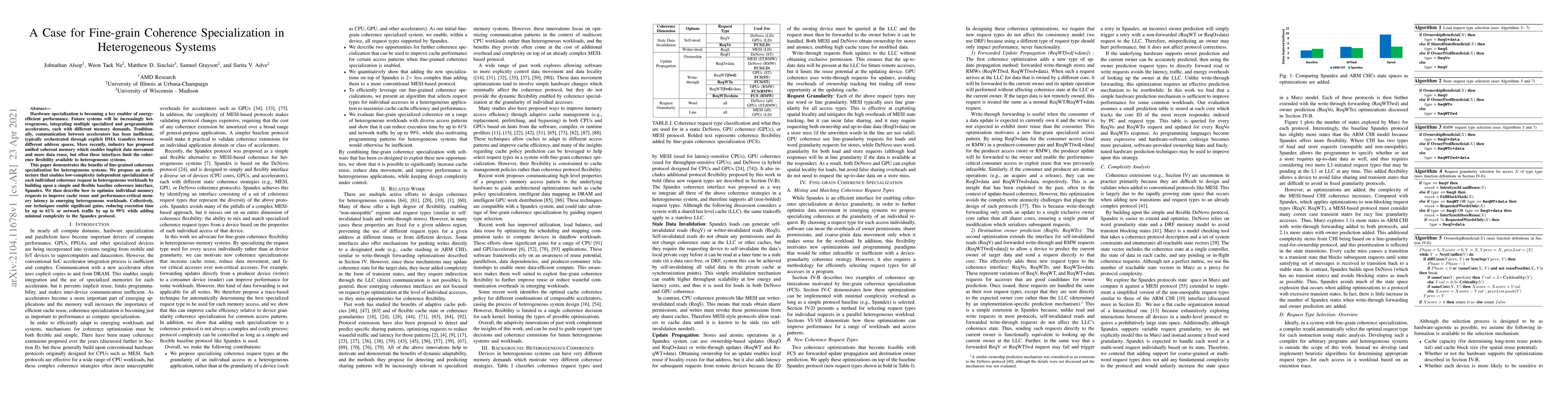 This paper proposes a fine-grained coherence specialization technique for heterogeneous systems to improve performance and energy efficiency by optimizing memory requests and reducing execution time or network traffic significantly with minimal protocol complexity. The proposed Spandex architecture enables independent specialization of coherence requests, leading to up to 61% reduction in execution time or 99% reduction in network traffic.