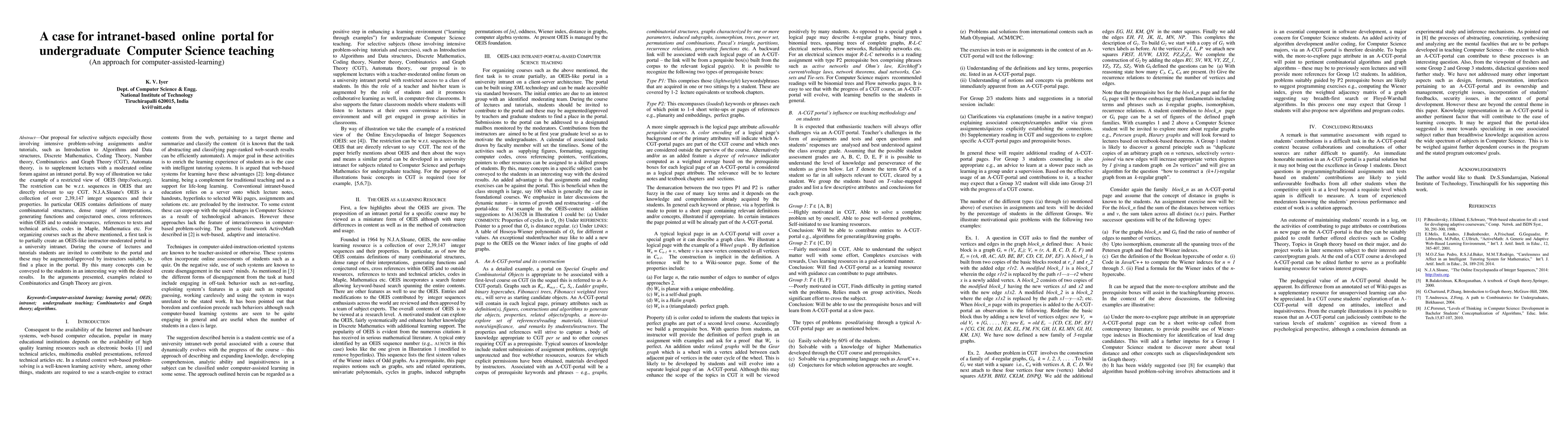 Our proposal for selective subjects especially those involving intensive problem-solving assignments and/or tutorials, such as Introduction to Algorithms and Data structures, Discrete Mathematics, Coding Theory, Number theory, Combinatorics and Graph Theory (CGT), Automata theory, is to supplement lectures with a moderated online forum against an intranet portal. By way of illustration we take the example of a restricted view of OEIS (http://oeis.org). The restriction can be w.r.t. sequences in OEIS that are directly relevant to say CGT. N.J.A.Sloane's OEIS is a collection of over 2,39,147 integer sequences and their properties. In particular OEIS contains definitions of many combinatorial structures, dense range of interpretations, generating functions and conjectured ones, cross references within OEIS and to outside resources, references to texts and technical articles, codes in Maple, Mathematica etc. For organizing courses such as the above mentioned, a first task is to partially create an OEIS-like instructor-moderated portal in a university intranet. During the course of lectures and tutorials students are invited to contribute to the portal and these may be augmented/approved by instructors suitably, to find a place in the portal. By this many concepts can be conveyed to the students in an interesting way with the desired results. In the arguments presented, examples related to CGT are given.
