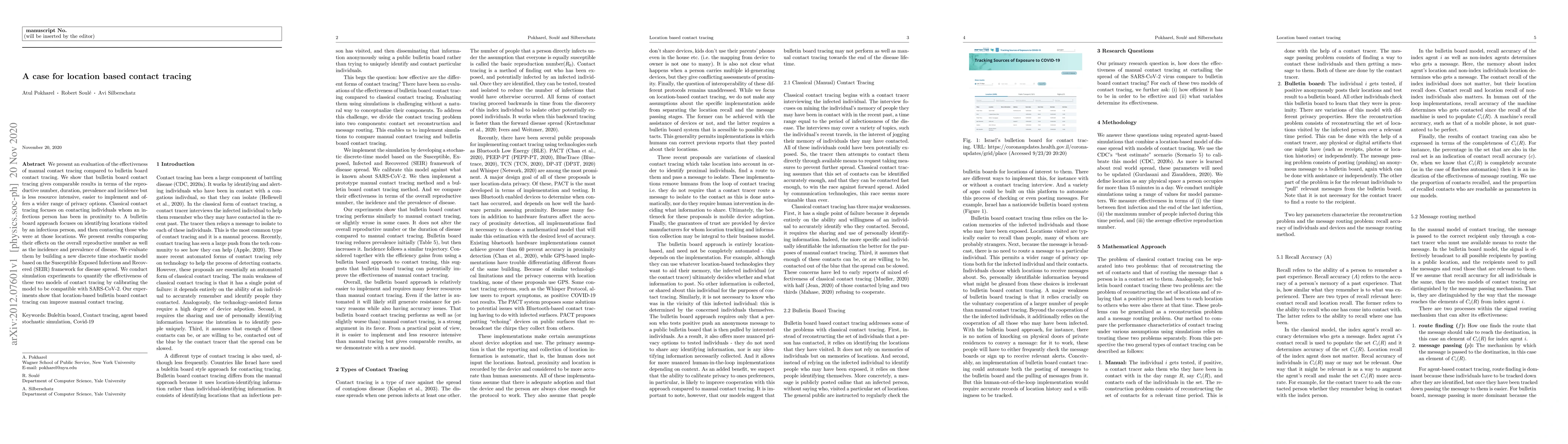 We present an evaluation of the effectiveness of manual contact tracing compared to bulletin board contact tracing. We show that bulletin board contact tracing gives comparable results in terms of the reproductive number, duration, prevalence and incidence but is less resource intensive, easier to implement and offers a wider range of privacy options. Classical contact tracing focuses on contacting individuals whom an infectious person has been in proximity to. A bulletin board approach focuses on identifying locations visited by an infectious person, and then contacting those who were at those locations. We present results comparing their effects on the overall reproductive number as well as the incidence and prevalence of disease. We evaluate them by building a new discrete time stochastic model based on the Susceptible Exposed Infectious and Recovered (SEIR) framework for disease spread. We conduct simulation experiments to quantify the effectiveness of these two models of contact tracing by calibrating the model to be compatible with SARS-CoV-2. Our experiments show that location-based bulletin board contact tracing can improve manual contact tracing.