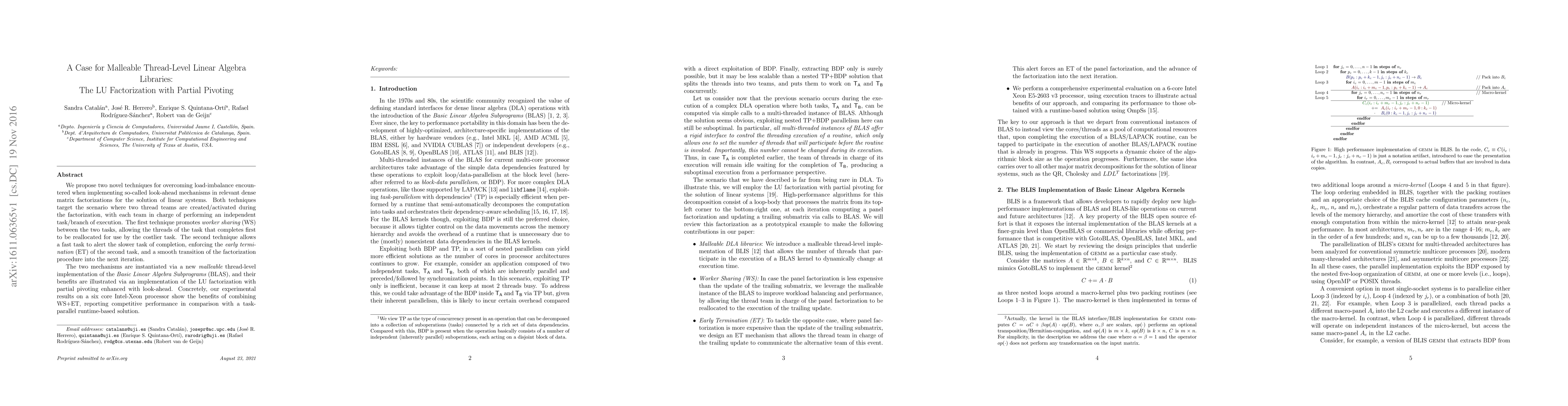 We propose two novel techniques for overcoming load-imbalance encountered when implementing so-called look-ahead mechanisms in relevant dense matrix factorizations for the solution of linear systems. Both techniques target the scenario where two thread teams are created/activated during the factorization, with each team in charge of performing an independent task/branch of execution. The first technique promotes worker sharing (WS) between the two tasks, allowing the threads of the task that completes first to be reallocated for use by the costlier task. The second technique allows a fast task to alert the slower task of completion, enforcing the early termination (ET) of the second task, and a smooth transition of the factorization procedure into the next iteration. The two mechanisms are instantiated via a new malleable thread-level implementation of the Basic Linear Algebra Subprograms (BLAS), and their benefits are illustrated via an implementation of the LU factorization with partial pivoting enhanced with look-ahead. Concretely, our experimental results on a six core Intel-Xeon processor show the benefits of combining WS+ET, reporting competitive performance in comparison with a task-parallel runtime-based solution.