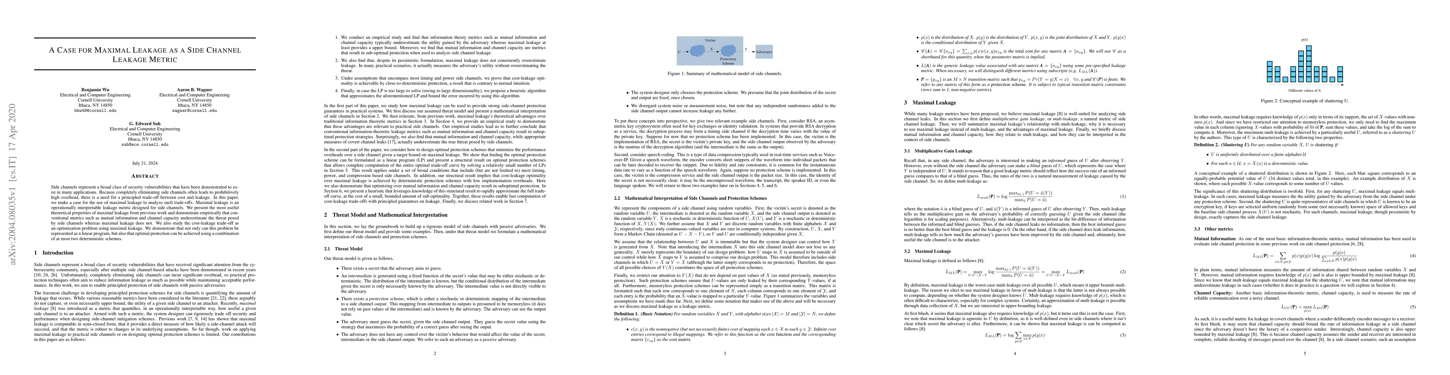 This paper advocates for maximal leakage as a metric to evaluate side channel vulnerabilities, arguing it better captures the threat compared to conventional metrics like mutual information. It shows that maximal leakage can be optimized using a linear program, often requiring just two deterministic schemes for optimal protection.