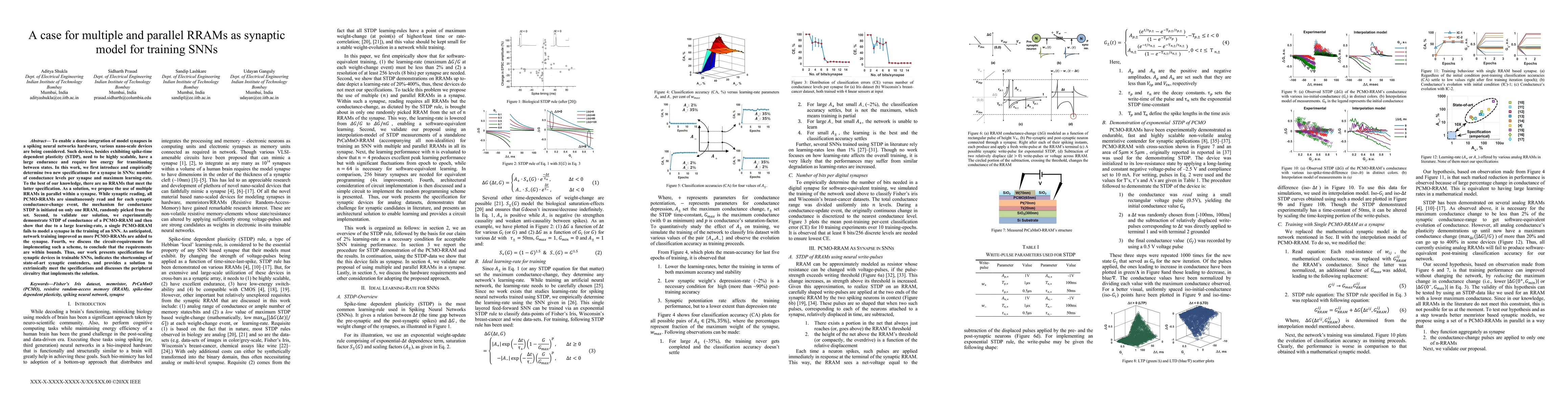 This research proposes using multiple PCMO-RRAMs in parallel for synaptic modeling in Spiking Neural Networks (SNNs) hardware to meet scalability, endurance, and energy efficiency requirements. Experiments demonstrate that a single PCMO-RRAM fails to model a synapse due to high learning-rate demands, but network training improves with added PCMO-RRAMs per synapse. The paper also discusses circuit requirements for this implementation, concluding they are feasible.