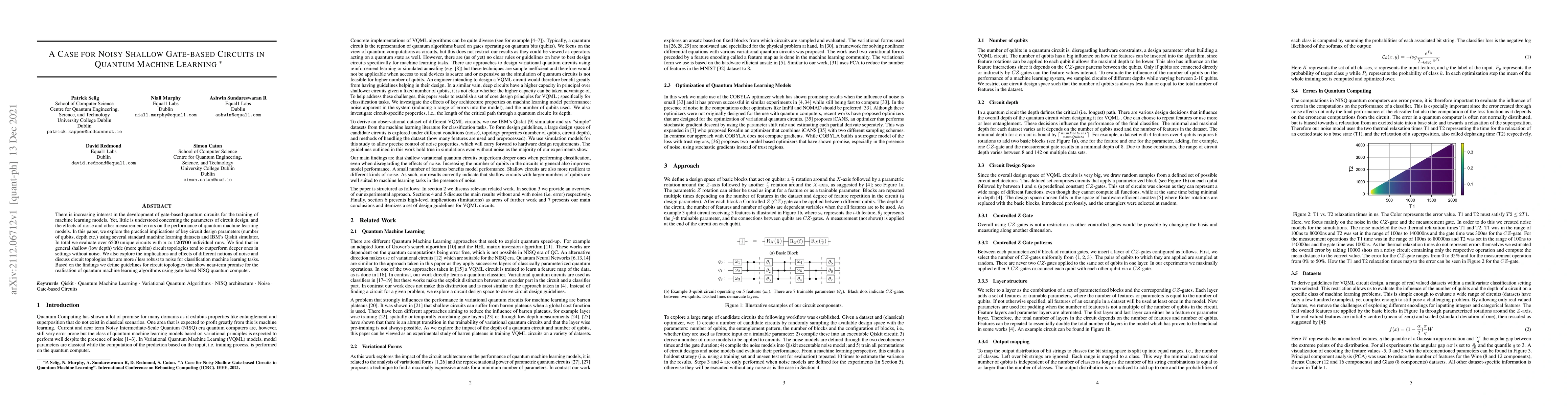 There is increasing interest in the development of gate-based quantum circuits for the training of machine learning models. Yet, little is understood concerning the parameters of circuit design, and the effects of noise and other measurement errors on the performance of quantum machine learning models. In this paper, we explore the practical implications of key circuit design parameters (number of qubits, depth etc.) using several standard machine learning datasets and IBM's Qiskit simulator. In total we evaluate over 6500 unique circuits with $n \approx 120700$ individual runs. We find that in general shallow (low depth) wide (more qubits) circuit topologies tend to outperform deeper ones in settings without noise. We also explore the implications and effects of different notions of noise and discuss circuit topologies that are more / less robust to noise for classification machine learning tasks. Based on the findings we define guidelines for circuit topologies that show near-term promise for the realisation of quantum machine learning algorithms using gate-based NISQ quantum computer.