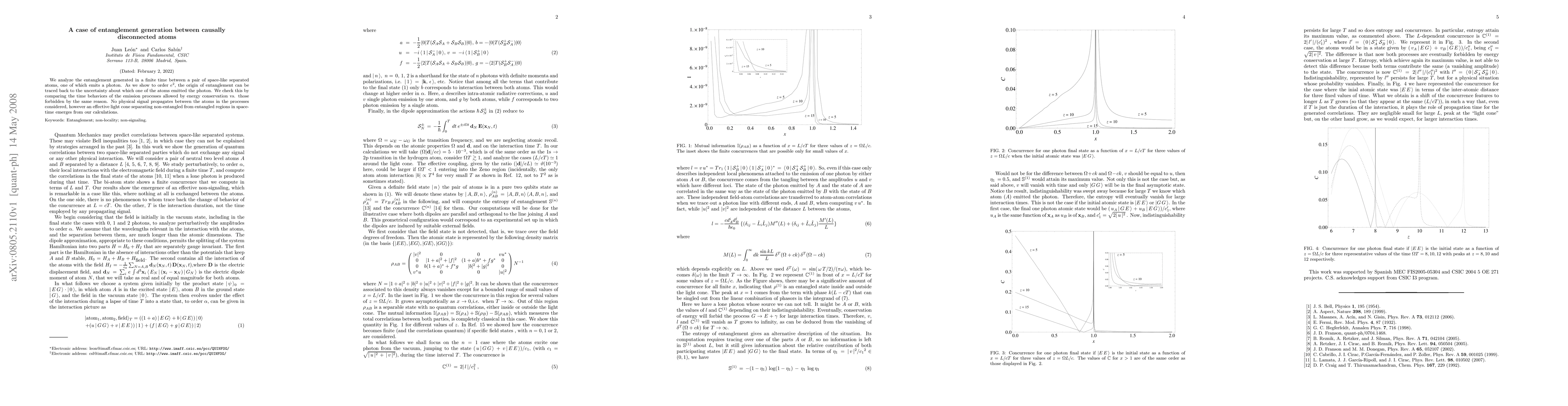 The paper presents a detailed analysis of entanglement generation between causally disconnected atoms, tracing its origin to emission uncertainty and identifying an effective light cone in space-time.