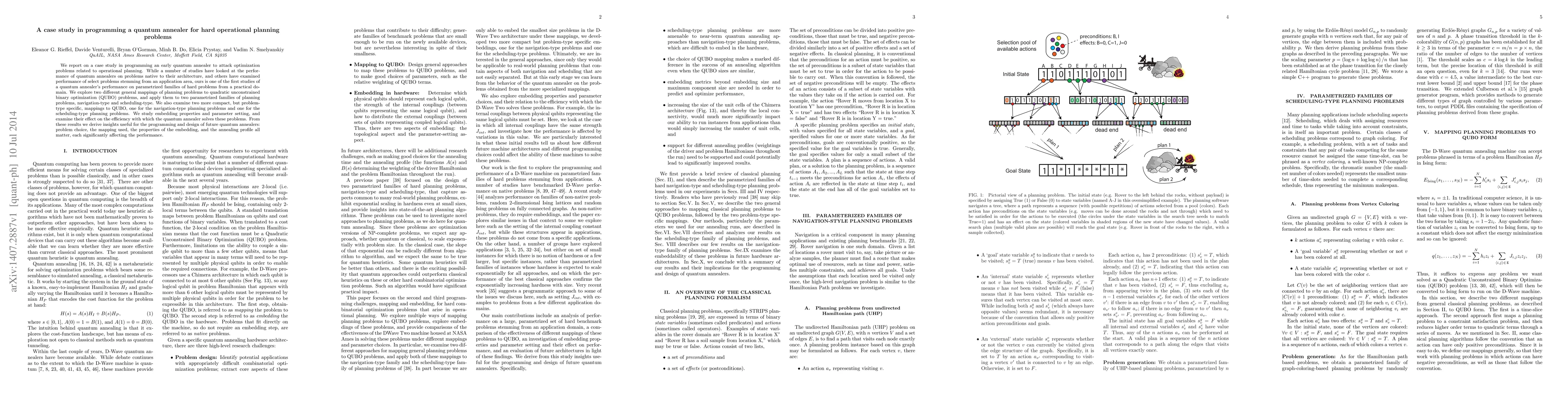 We report on a case study in programming an early quantum annealer to attack optimization problems related to operational planning. While a number of studies have looked at the performance of quantum annealers on problems native to their architecture, and others have examined performance of select problems stemming from an application area, ours is one of the first studies of a quantum annealer's performance on parametrized families of hard problems from a practical domain. We explore two different general mappings of planning problems to quadratic unconstrained binary optimization (QUBO) problems, and apply them to two parametrized families of planning problems, navigation-type and scheduling-type. We also examine two more compact, but problem-type specific, mappings to QUBO, one for the navigation-type planning problems and one for the scheduling-type planning problems. We study embedding properties and parameter setting, and examine their effect on the efficiency with which the quantum annealer solves these problems. From these results we derive insights useful for the programming and design of future quantum annealers: problem choice, the mapping used, the properties of the embedding, and the annealing profile all matter, each significantly affecting the performance.