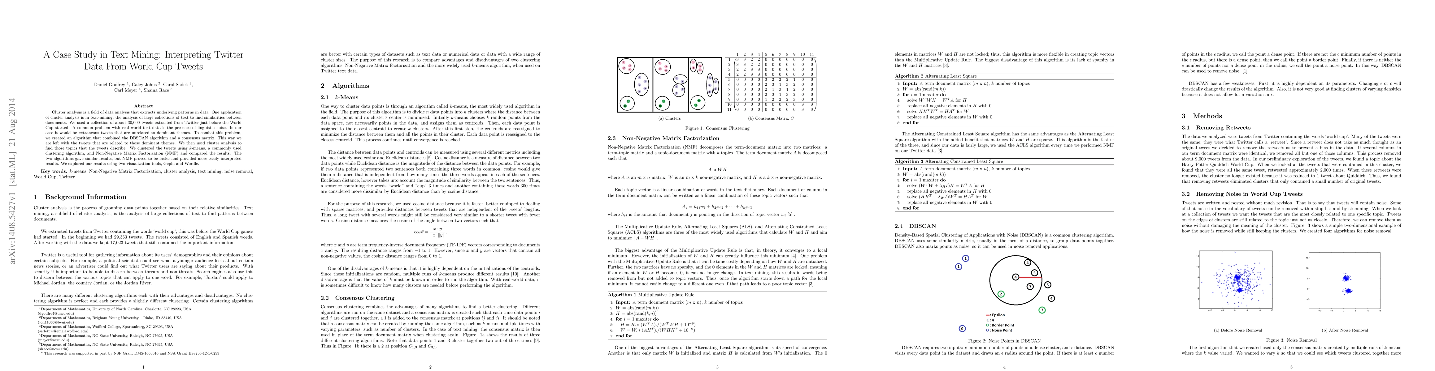 Cluster analysis is a field of data analysis that extracts underlying patterns in data. One application of cluster analysis is in text-mining, the analysis of large collections of text to find similarities between documents. We used a collection of about 30,000 tweets extracted from Twitter just before the World Cup started. A common problem with real world text data is the presence of linguistic noise. In our case it would be extraneous tweets that are unrelated to dominant themes. To combat this problem, we created an algorithm that combined the DBSCAN algorithm and a consensus matrix. This way we are left with the tweets that are related to those dominant themes. We then used cluster analysis to find those topics that the tweets describe. We clustered the tweets using k-means, a commonly used clustering algorithm, and Non-Negative Matrix Factorization (NMF) and compared the results. The two algorithms gave similar results, but NMF proved to be faster and provided more easily interpreted results. We explored our results using two visualization tools, Gephi and Wordle.