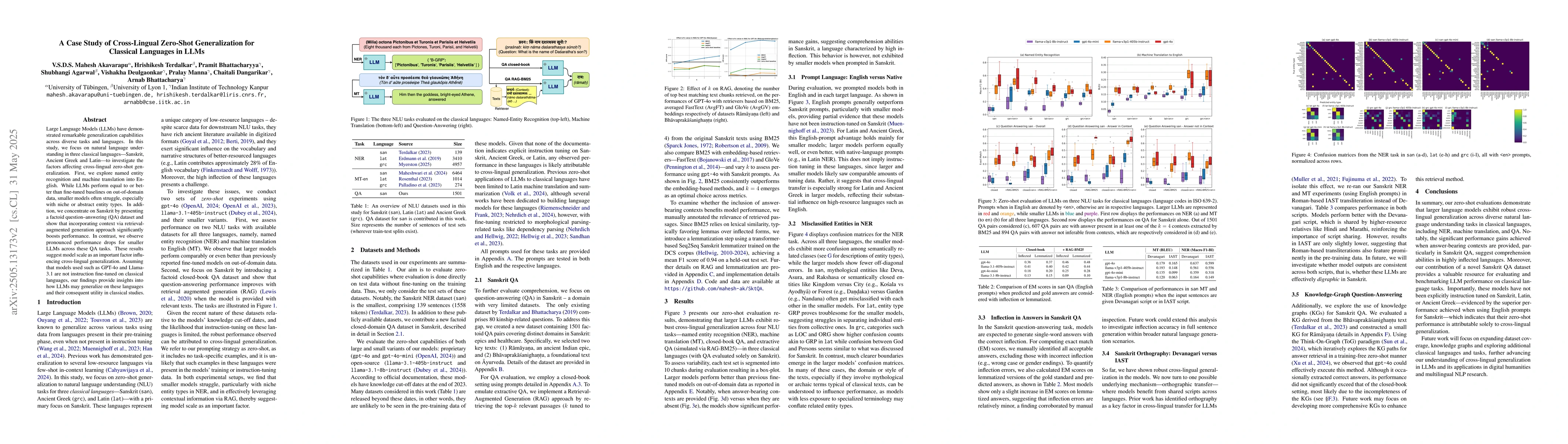 This study investigates cross-lingual zero-shot generalization in large language models for classical languages like Sanskrit, Ancient Greek, and Latin. It finds that model scale is a key factor influencing generalization, with smaller models struggling on niche entity types and certain question-answering tasks.