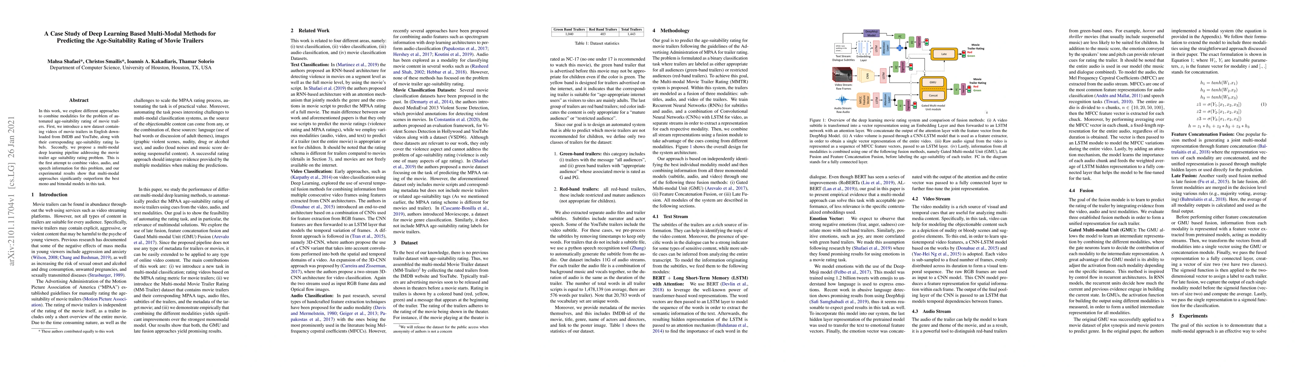 This paper presents a new dataset of movie trailers with age-suitability ratings and proposes a multi-modal deep learning method that combines video, audio, and speech information to predict these ratings, achieving superior results compared to mono and bimodal models.