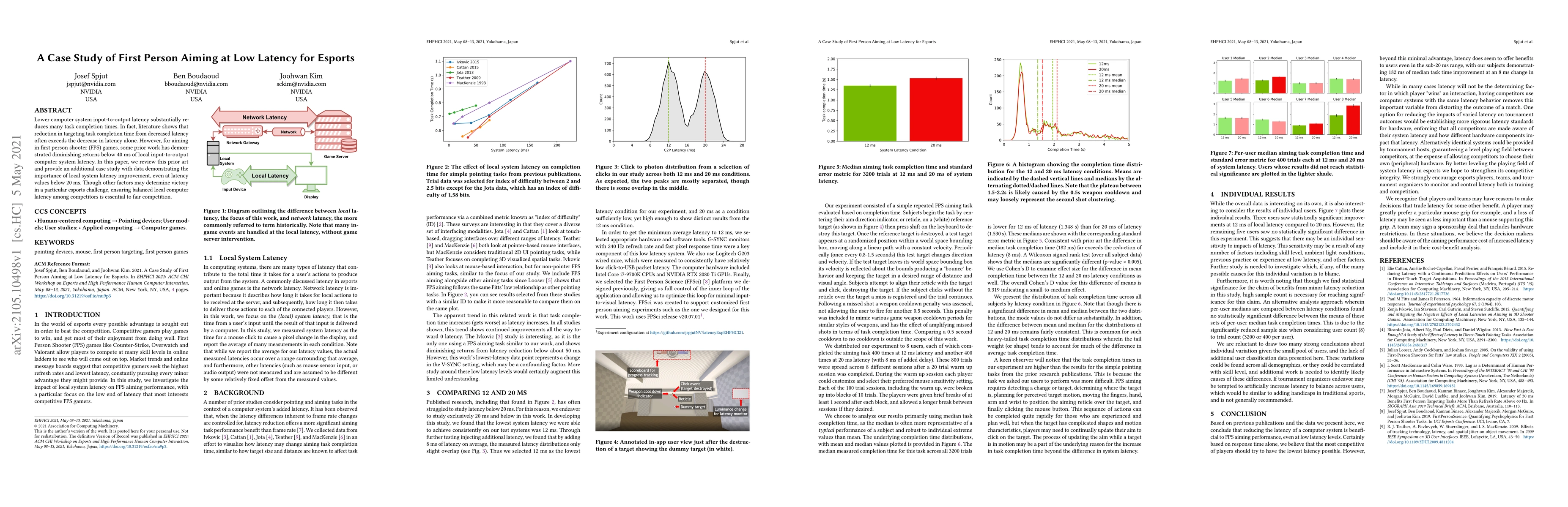 Lower computer system input-to-output latency substantially reduces many task completion times. In fact, literature shows that reduction in targeting task completion time from decreased latency often exceeds the decrease in latency alone. However, for aiming in first person shooter (FPS) games, some prior work has demonstrated diminishing returns below 40 ms of local input-to-output computer system latency. In this paper, we review this prior art and provide an additional case study with data demonstrating the importance of local system latency improvement, even at latency values below 20 ms. Though other factors may determine victory in a particular esports challenge, ensuring balanced local computer latency among competitors is essential to fair competition.