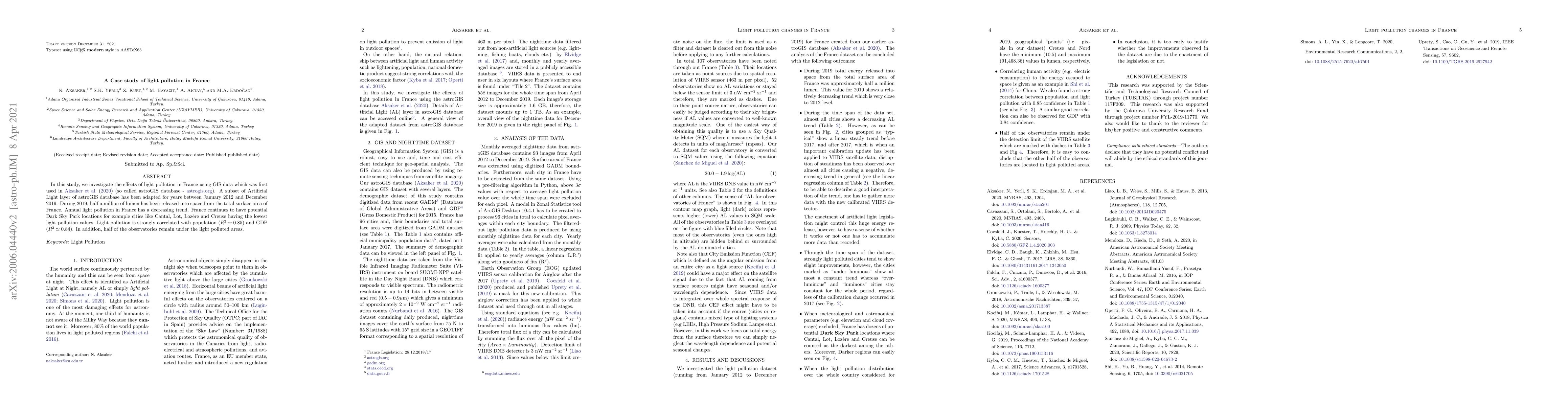 This study evaluates France's 2019 artificial light legislation using GIS data, finding a 6% decrease in annual light pollution. It notes a strong correlation between population density and light pollution, and a weaker one with GDP. The effect attribution to legislation is still inconclusive due to insufficient time since implementation.