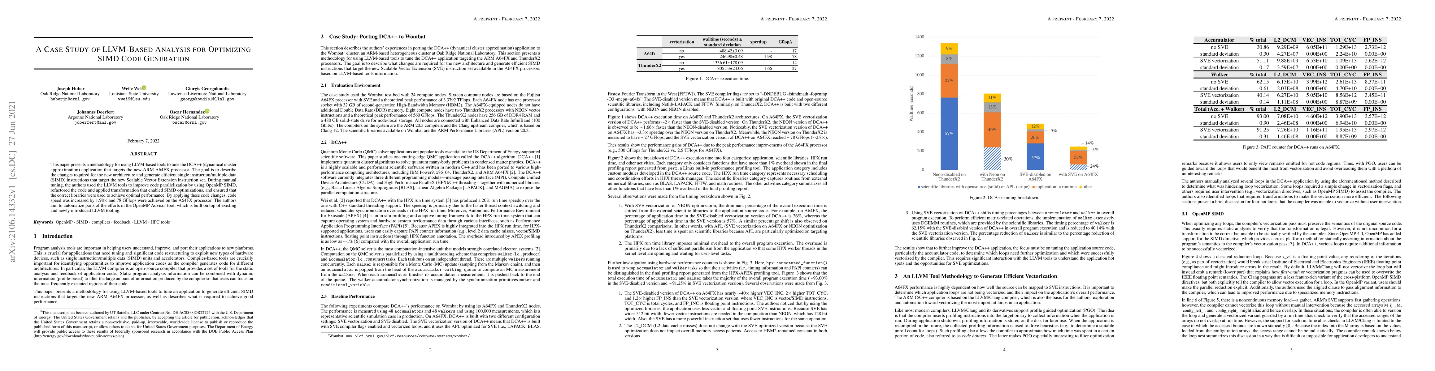 This paper presents a methodology for using LLVM-based tools to tune the DCA++ (dynamical clusterapproximation) application that targets the new ARM A64FX processor. The goal is to describethe changes required for the new architecture and generate efficient single instruction/multiple data(SIMD) instructions that target the new Scalable Vector Extension instruction set. During manualtuning, the authors used the LLVM tools to improve code parallelization by using OpenMP SIMD,refactored the code and applied transformation that enabled SIMD optimizations, and ensured thatthe correct libraries were used to achieve optimal performance. By applying these code changes, codespeed was increased by 1.98X and 78 GFlops were achieved on the A64FX processor. The authorsaim to automatize parts of the efforts in the OpenMP Advisor tool, which is built on top of existingand newly introduced LLVM tooling.