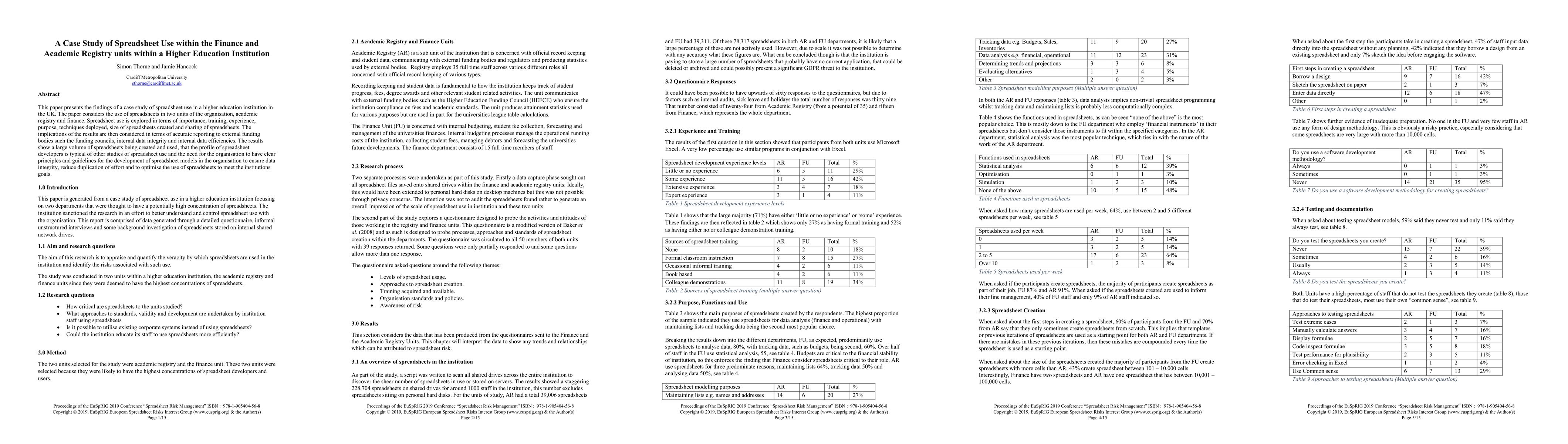 This case study examines spreadsheet use in the finance and academic registry units of a UK higher education institution, highlighting the need for clear guidelines to ensure data integrity and efficiency. The findings suggest significant spreadsheet creation and a typical developer profile, emphasizing the importance of organizational principles for optimal spreadsheet deployment.