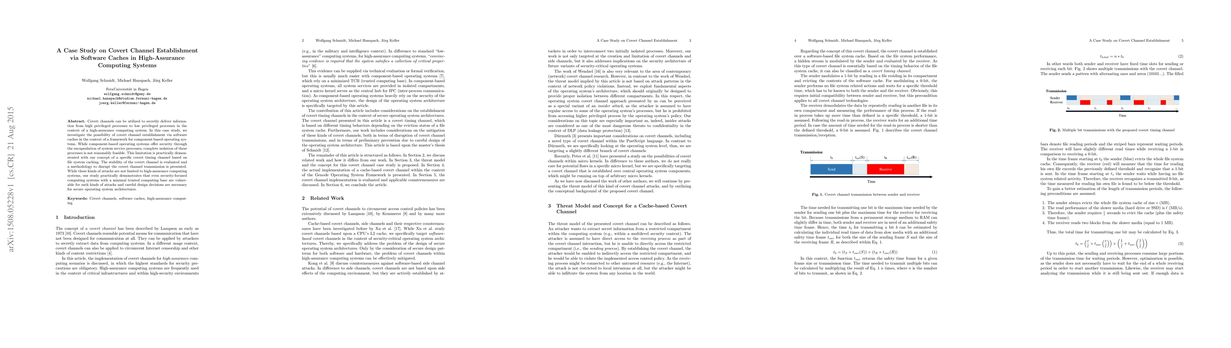 This paper investigates covert channel establishment via software caches in high-assurance computing systems, demonstrating a timing channel based on file system caching. The study highlights vulnerabilities in component-based operating systems despite their security features, and proposes a methodology to disrupt such covert channels.