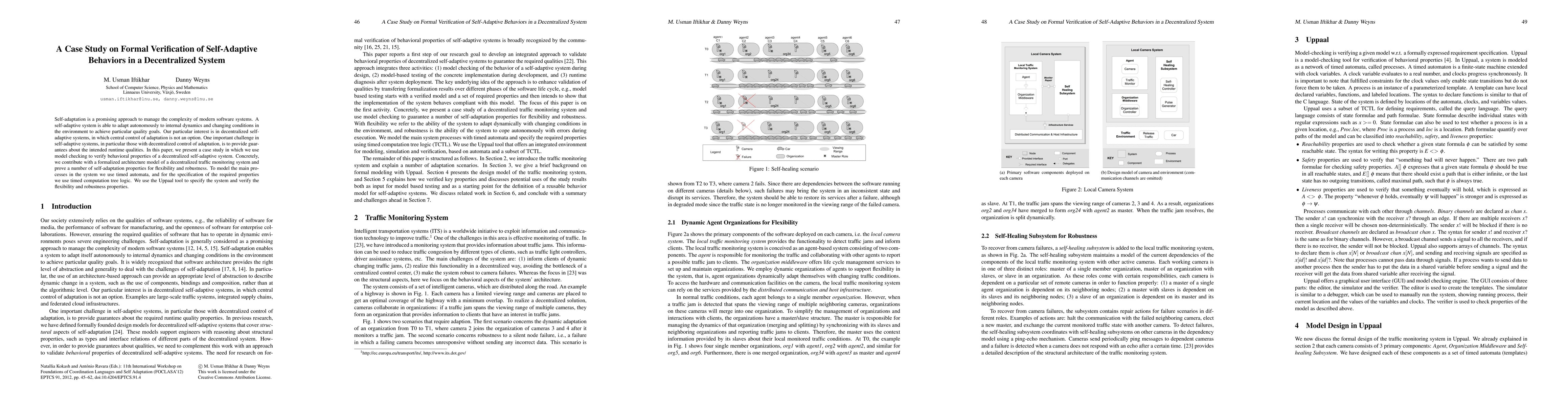 This paper presents a case study on formal verification of self-adaptive behaviors in a decentralized system using model checking. The authors formalize a decentralized traffic monitoring system architecture and verify its flexibility and robustness properties using timed automata and Uppaal tool.