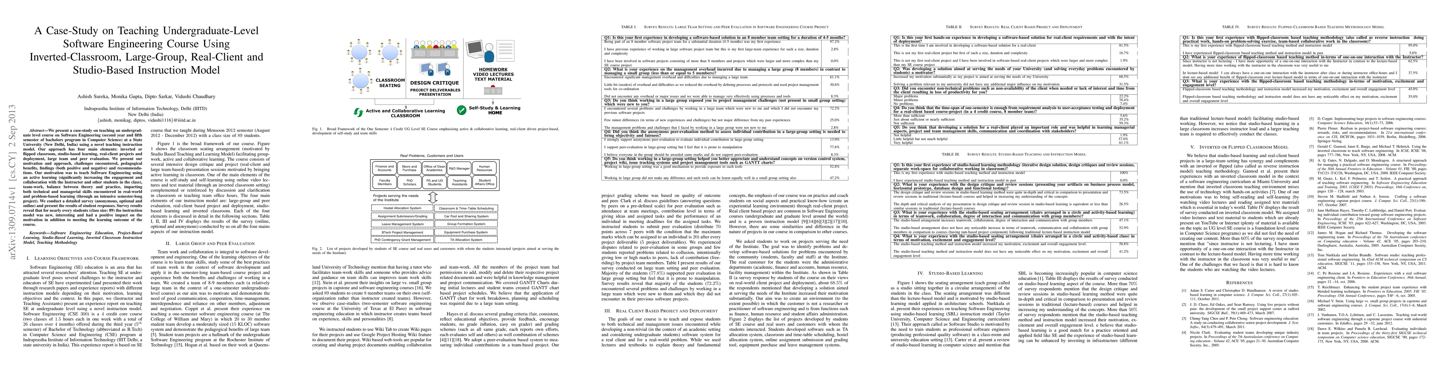 This case-study explores an innovative teaching model for an undergraduate Software Engineering course using flipped classroom, studio-based learning, real-client projects, and large-team peer evaluation. The study found that the model significantly increased student engagement and motivation, despite some challenges.