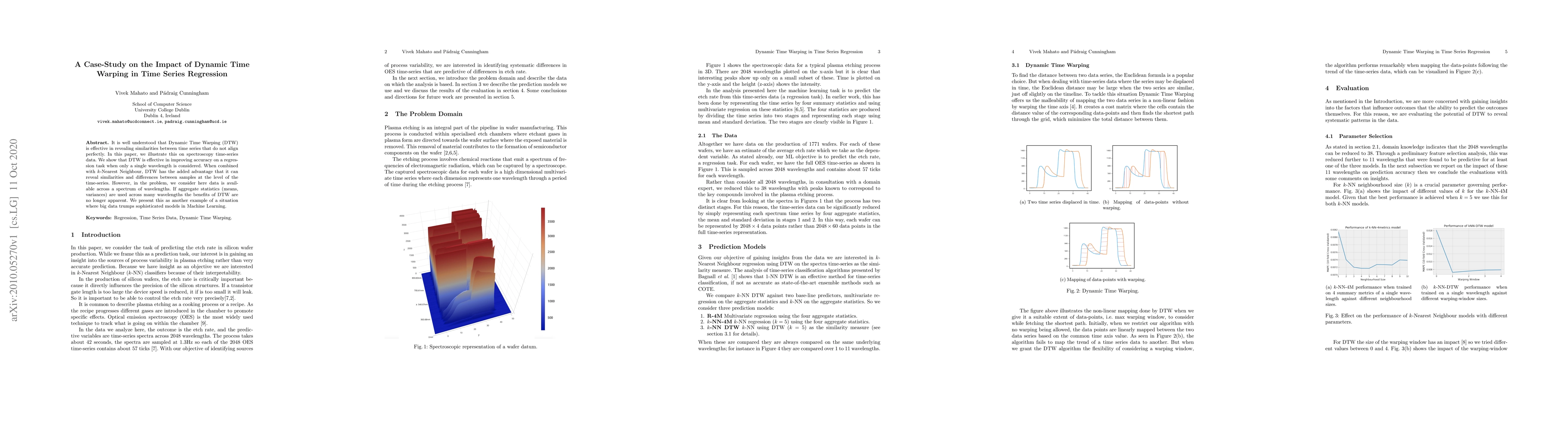 It is well understood that Dynamic Time Warping (DTW) is effective in revealing similarities between time series that do not align perfectly. In this paper, we illustrate this on spectroscopy time-series data. We show that DTW is effective in improving accuracy on a regression task when only a single wavelength is considered. When combined with k-Nearest Neighbour, DTW has the added advantage that it can reveal similarities and differences between samples at the level of the time-series. However, in the problem, we consider here data is available across a spectrum of wavelengths. If aggregate statistics (means, variances) are used across many wavelengths the benefits of DTW are no longer apparent. We present this as another example of a situation where big data trumps sophisticated models in Machine Learning.